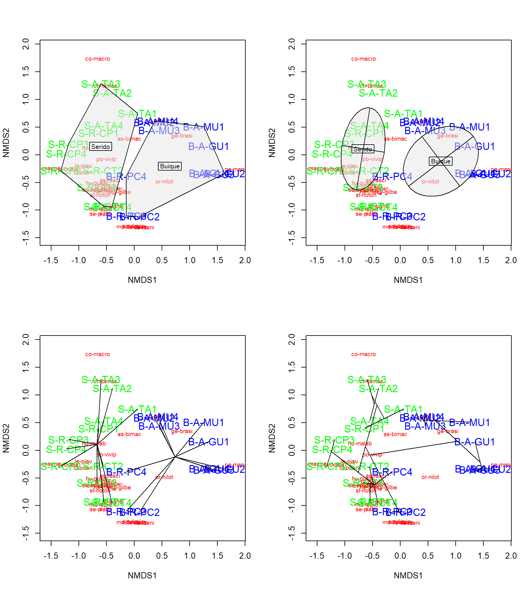 Essa é uma maneira intuitiva de entender como as comunidades e espécies se agrupam com base nos tratamentos possveis. Nesse caso, grupos com cores diferentes. Também é possível plotar elipses e “gráficos de aranha” usando as funções ordiellipse e orderspider, que enfatizam o centróide das comunidades em cada agrupamento.