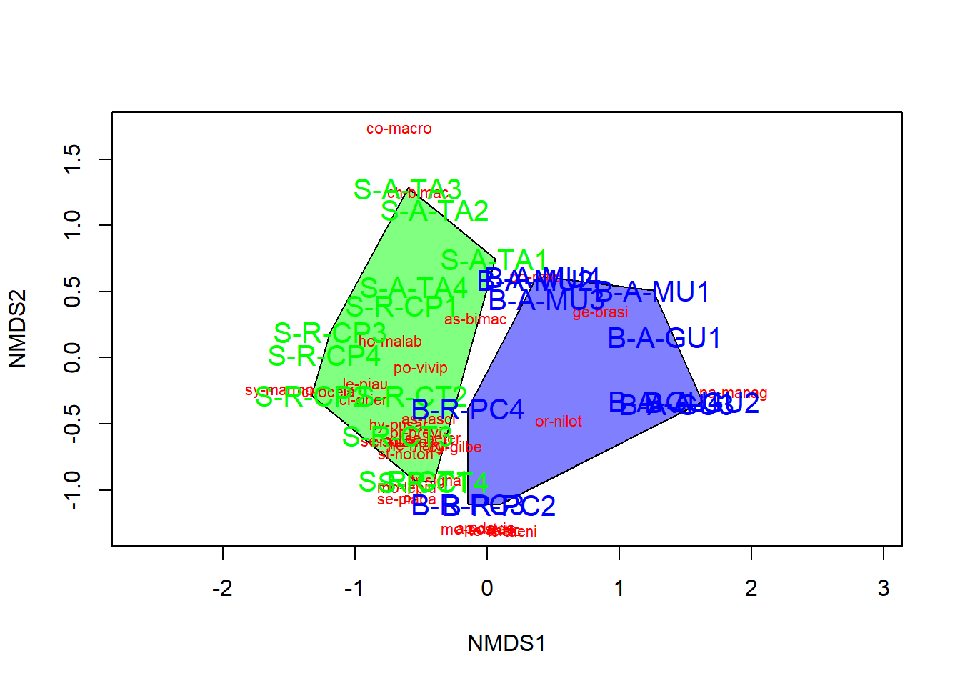 ordihull(nmds$point[grep(i,grupos),],draw="polygon",groups=grupos[grupos==i],col=colors[grep(i,grupos)],label=F) }