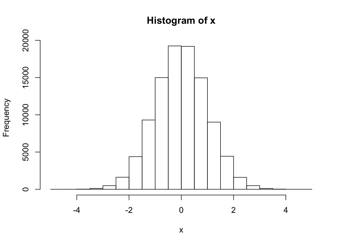 ## [1] 1.0648067 -1.1829477 0.4740945 0.4088807 -2.2009433Låt oss ta ett större stickprov, spara resultatet som x och skapa ett histogram, med funktionen hist().