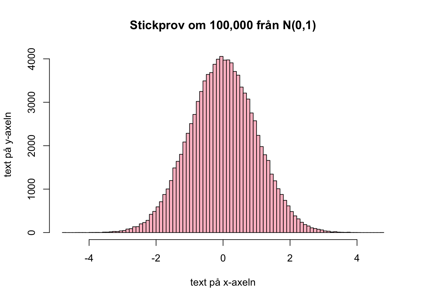 ## [1] -0.27390581 -0.14394617 1.63325971 -0.02013161 -1.02896247Ofta har funktionernas argument ett “default” värde. Det vill säga, ett värde på argumentet om du inte själv specifierar det. I fallet rnorm() kan du säkert gissa dig till vilket medelvärde och vilken standardavvikelse som är default, nämligen mean=0 och sd=1, det vill säga Z-fördelningen. Stickprovsstorlek har däremot inget default, och måste specifieras manuellt.