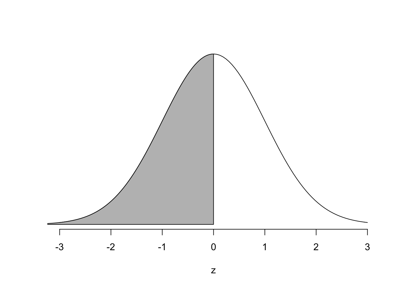 En annan funktion vi kommer använda är pnorm(). pnorm() ger dig arean under en normalfördelningskurva för en given normalfördelning. Säg till exempel att vi har en normalfördelning med medelvärde 0 och standardavvikelse 1, det vill säga \(N(0,1)\). Med pnorm() kan du då hitta \(Pr(Z\leq z)\), det vill säga, sannolikheten att ett slumpmässigt valt tal från Z-fördelningen är mindre eller lika med \(z\). För \(z=0\) skriver du