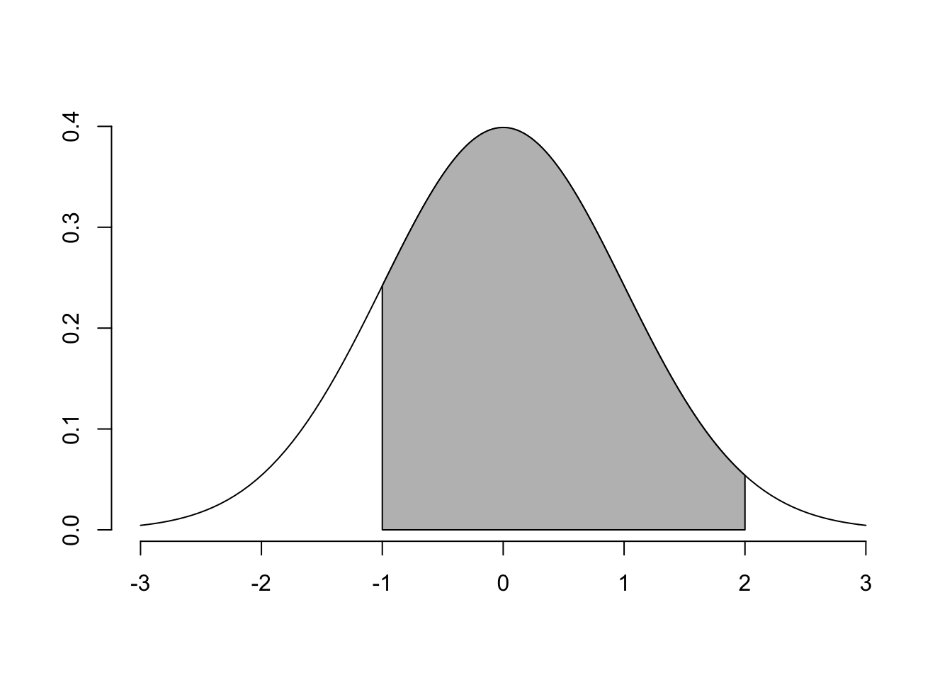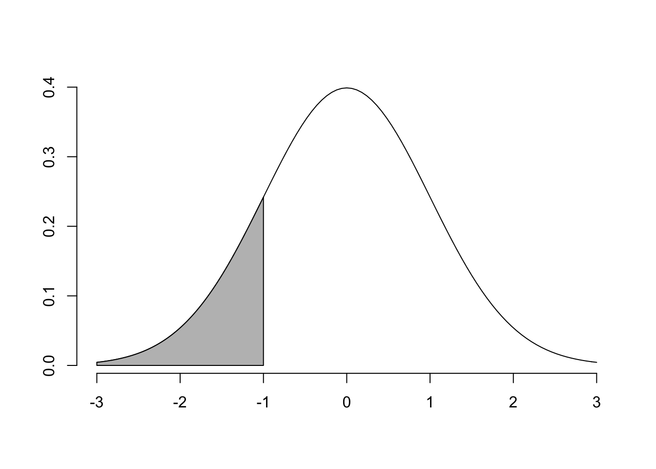 ## [1] 0.3413447Faktum är att vi inte ens behöver specifiera mean=0 och sd=1 eftersom funktionen antar att du menar standard normal om inget annat anges