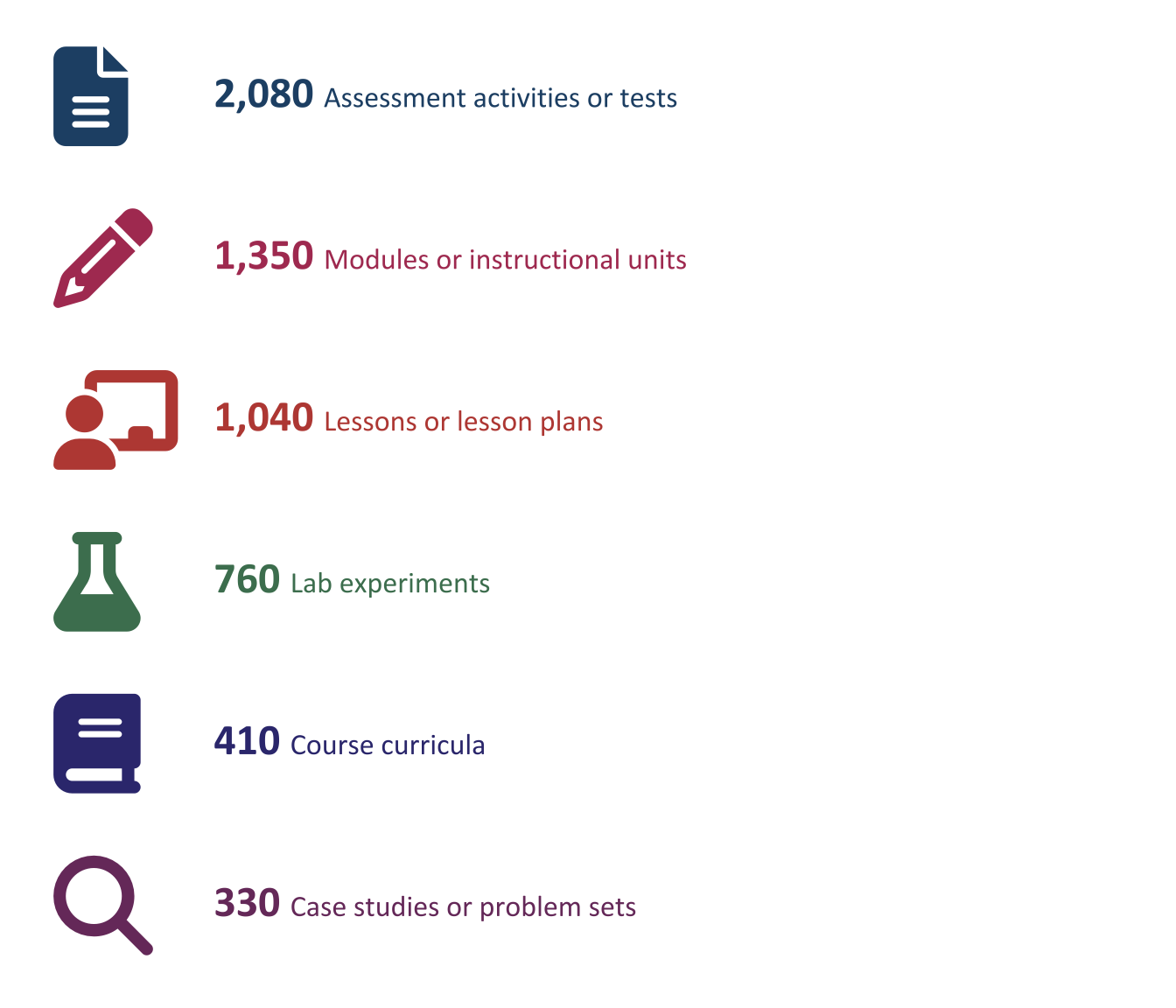 Additional materials developed include 320 instructor guides, 210 interactive simulations, 200 program curricula, and 20 textbooks.
