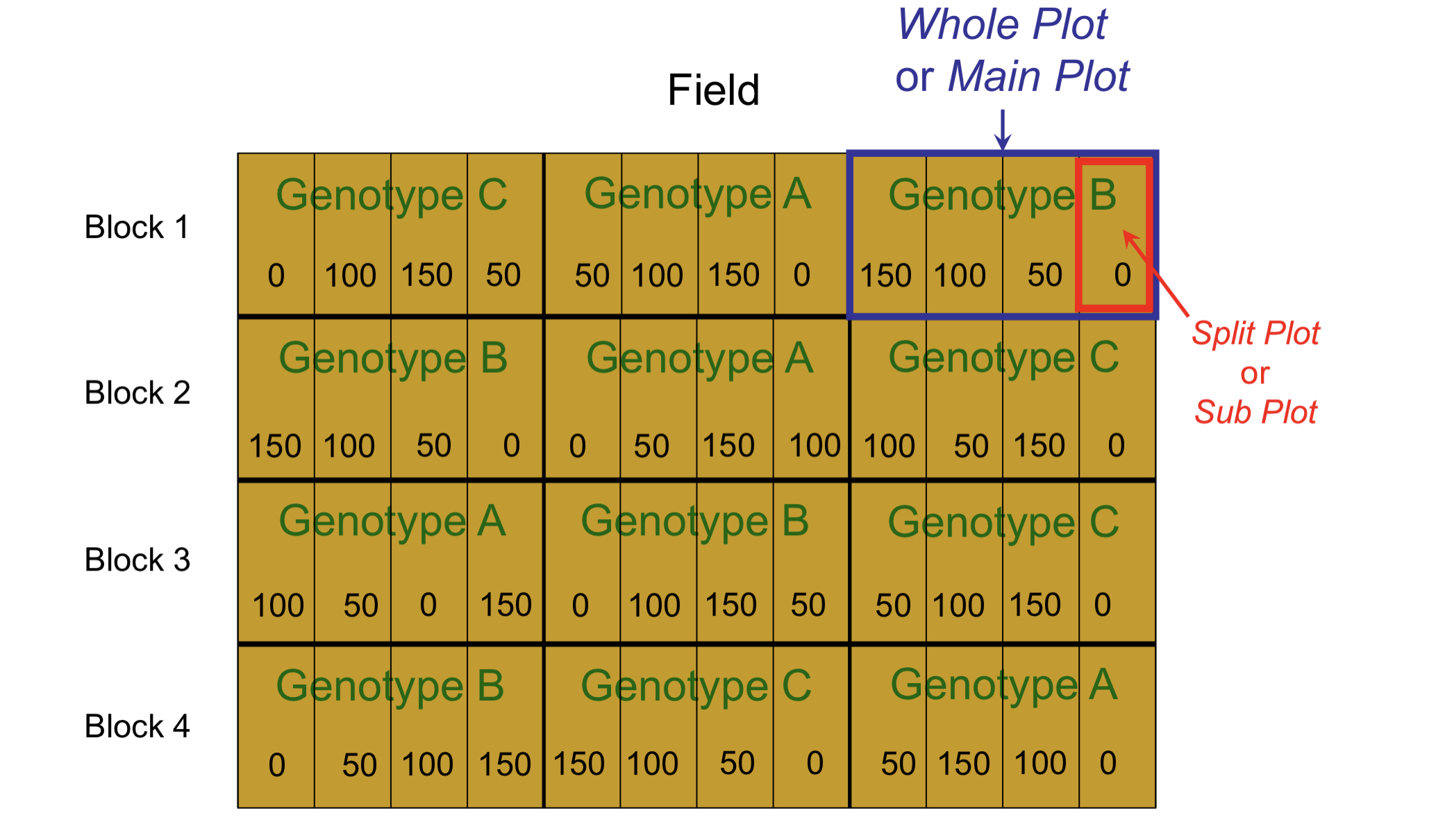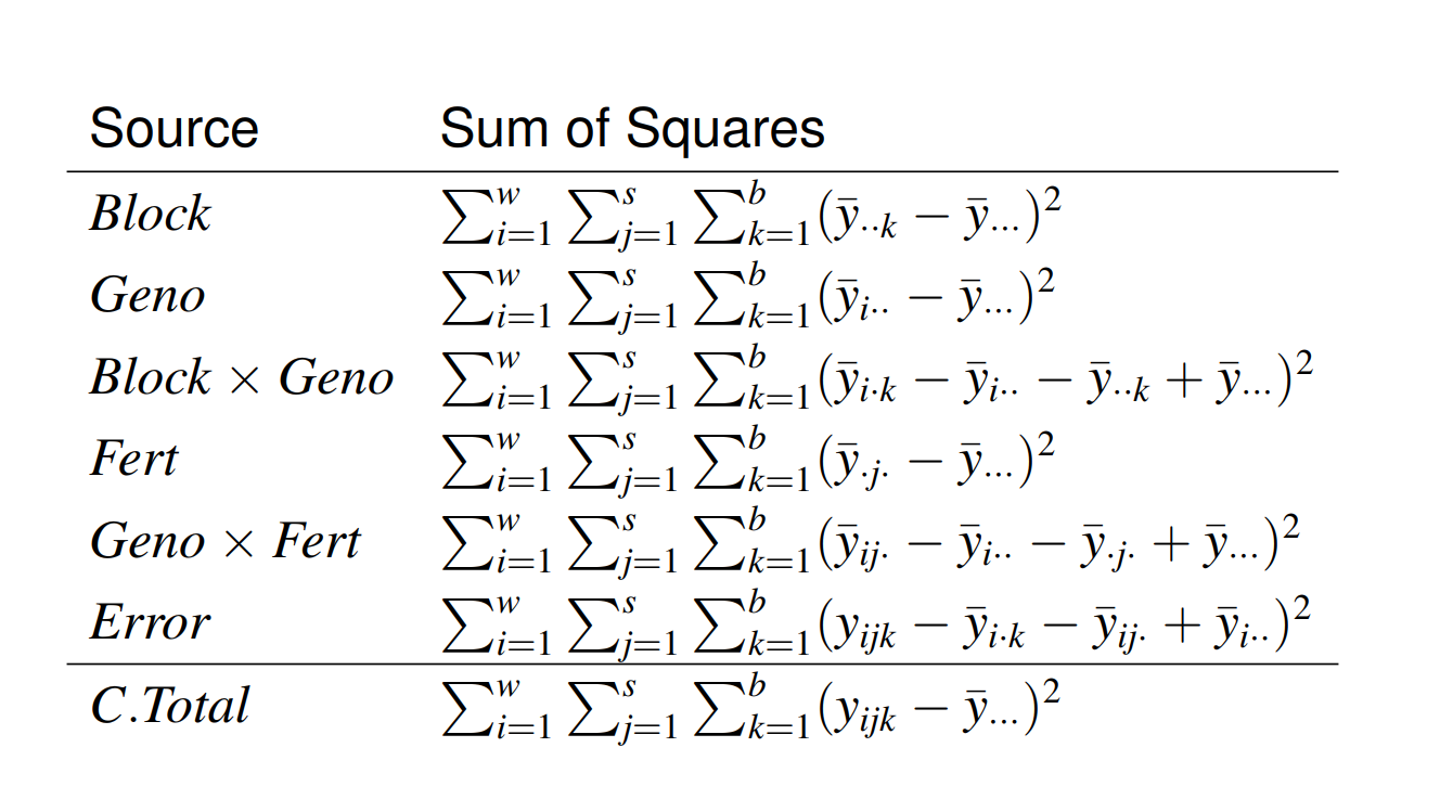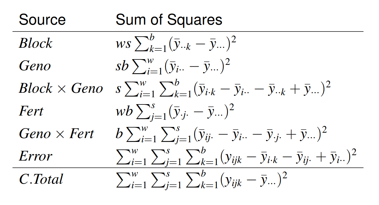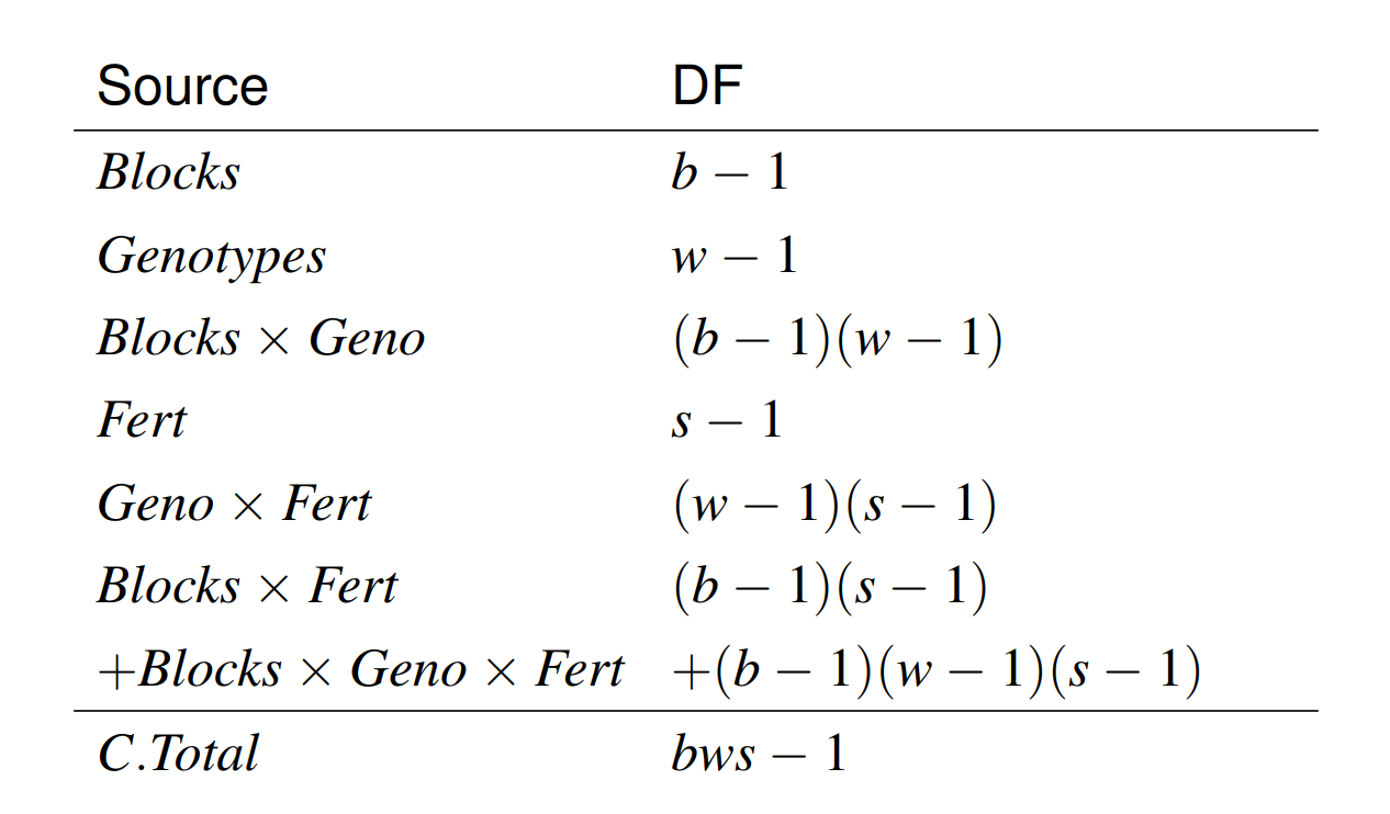 Model: \(y_{ijk} = \mu_{ij} + b_k + w_{ik} + e_{ijk}\), Genotype \(i = 1, 2, 3\), Fertilizer \(j = 1,2, 3,4\), Block \(k = 1, 2, 3, 4\).