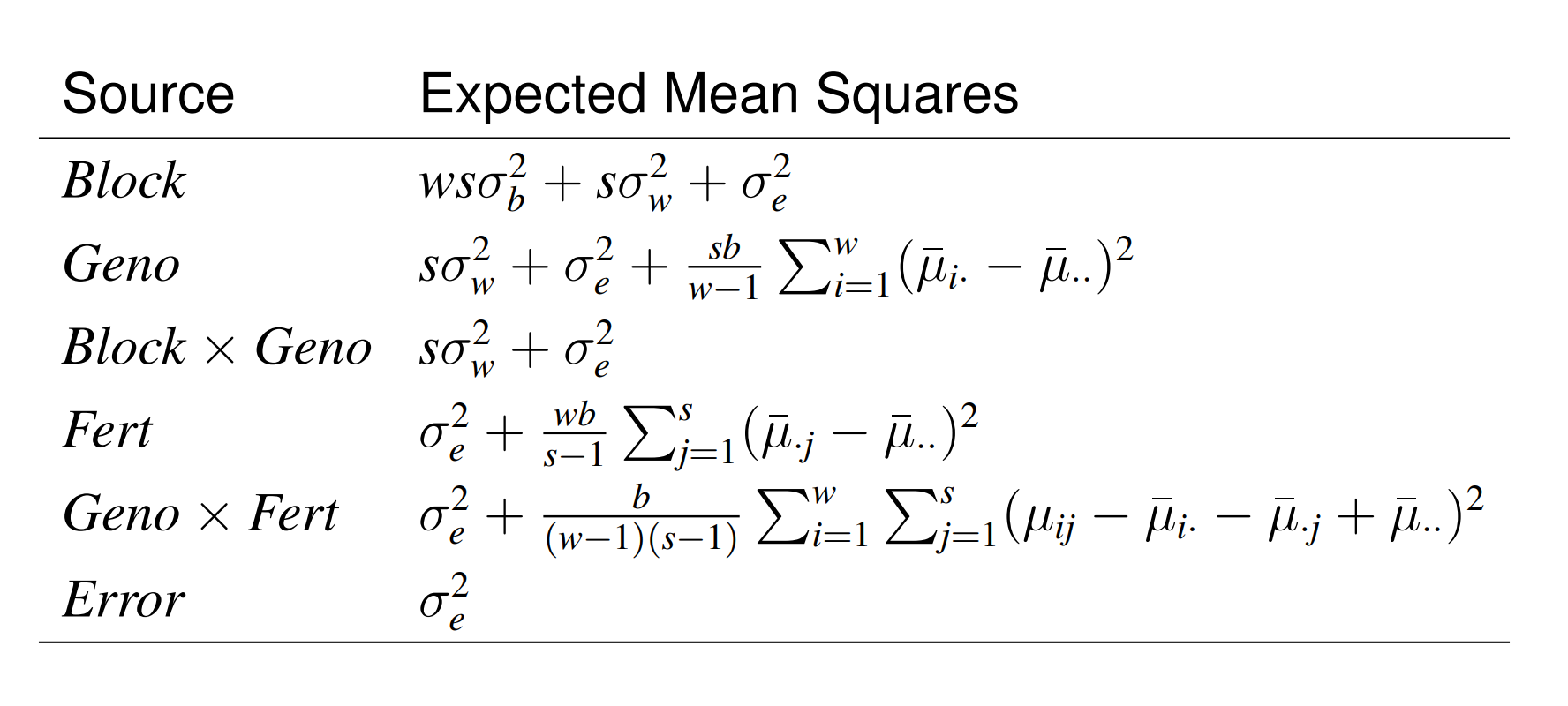 \[ \begin{aligned}E\left(M S_{F e r t}\right) &=\frac{w b}{s-1} \sum_{j=1}^{s} E\left(\bar{y}_{.j .}-\bar{y}_{...}\right)^{2} \\&=\frac{w b}{s-1} \sum_{j=1}^{s} E\left(\bar{\mu}_{. j}-\bar{\mu}_{..}+\bar{e}_{. j.}-\bar{e}_{...}\right)^{2} \\&=\frac{w b}{s-1} \sum_{j=1}^{s}\left(\bar{\mu}_{. j}-\bar{\mu}_{..}\right)^{2}+\sigma_{e}^{2} \\ E(MS_{error}) & = \sigma_e^2 \end{aligned} \]