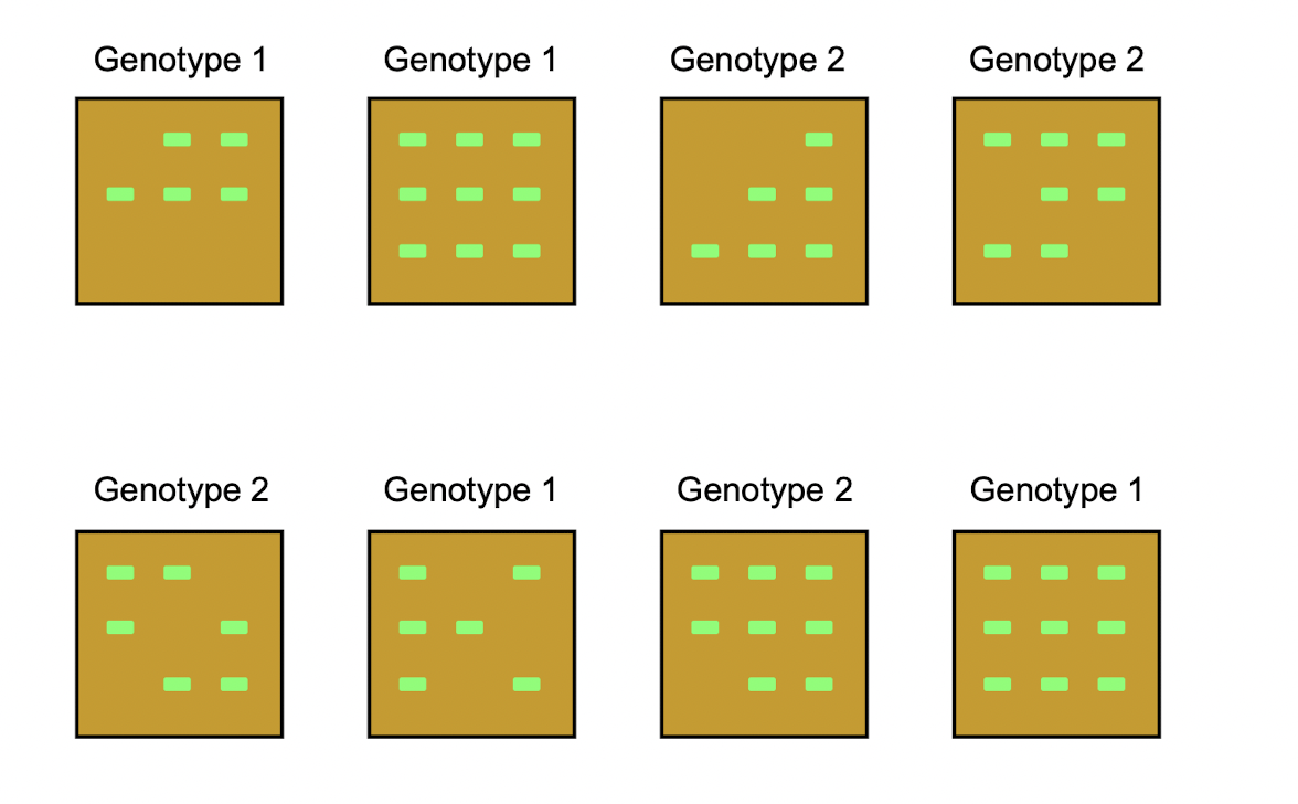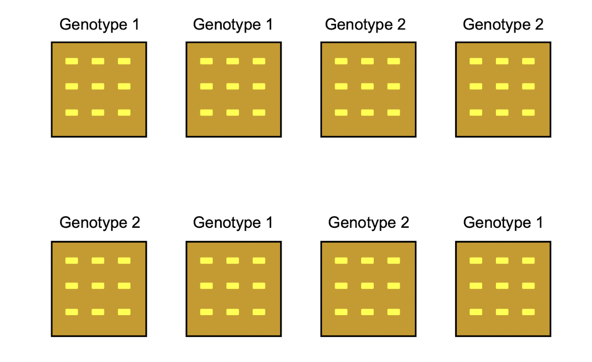 Researchers were interested in comparing the dry weight of maize seedlings from two different genotypes. For each genotype, nine seeds were planted in each of four trays. The eight trays in total were randomly positioned in a growth chamber. Three weeks after the emergence of the first seedling, emerged seedlings were harvested from each tray and individually weighed after drying to obtain one dry weight for each seedling. Although nine seeds were planted in each tray, fewer than nine seedlings emerged in many of the trays.