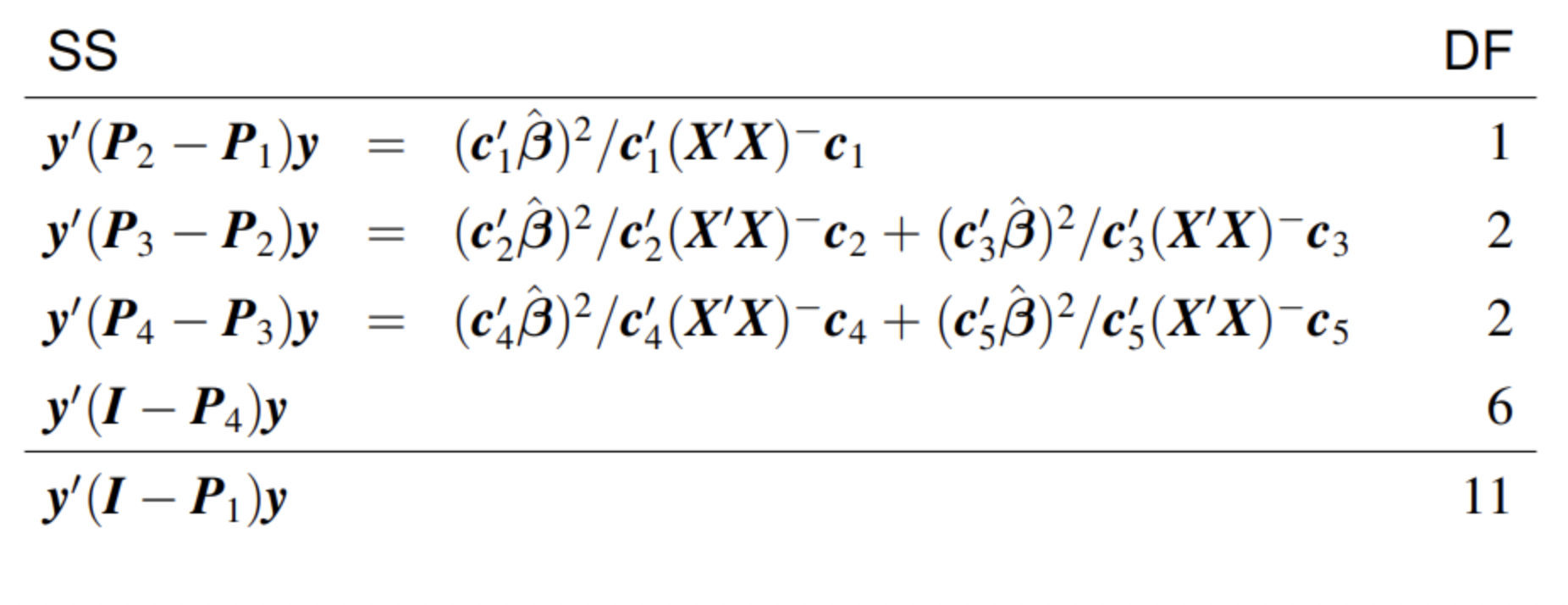 Suppose \(c_1'\beta, \ldots, c_q'\beta\) are pairwise orthogonal linear combinations. Let \(C' = [c_1, \ldots, c_q].\) When \(C\) has rank \(q\), \(\hat\beta'C'[C(X'X)^-C']^{-1}C\hat\beta = \sum_{i=1}^q (c_k'\hat\beta)^2/c_k'(X'X)^-c_k\).