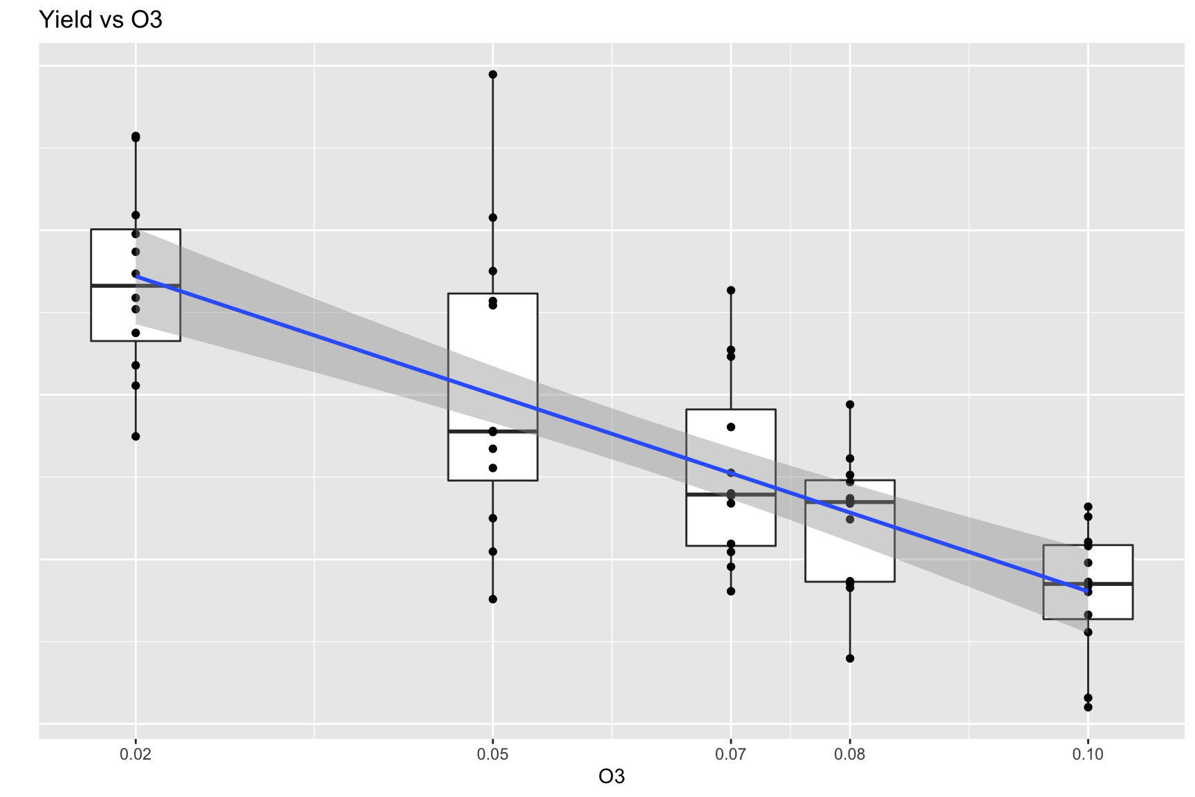ggplot(d, aes(x = O3, y = yield, group = O3)) + geom_boxplot() +