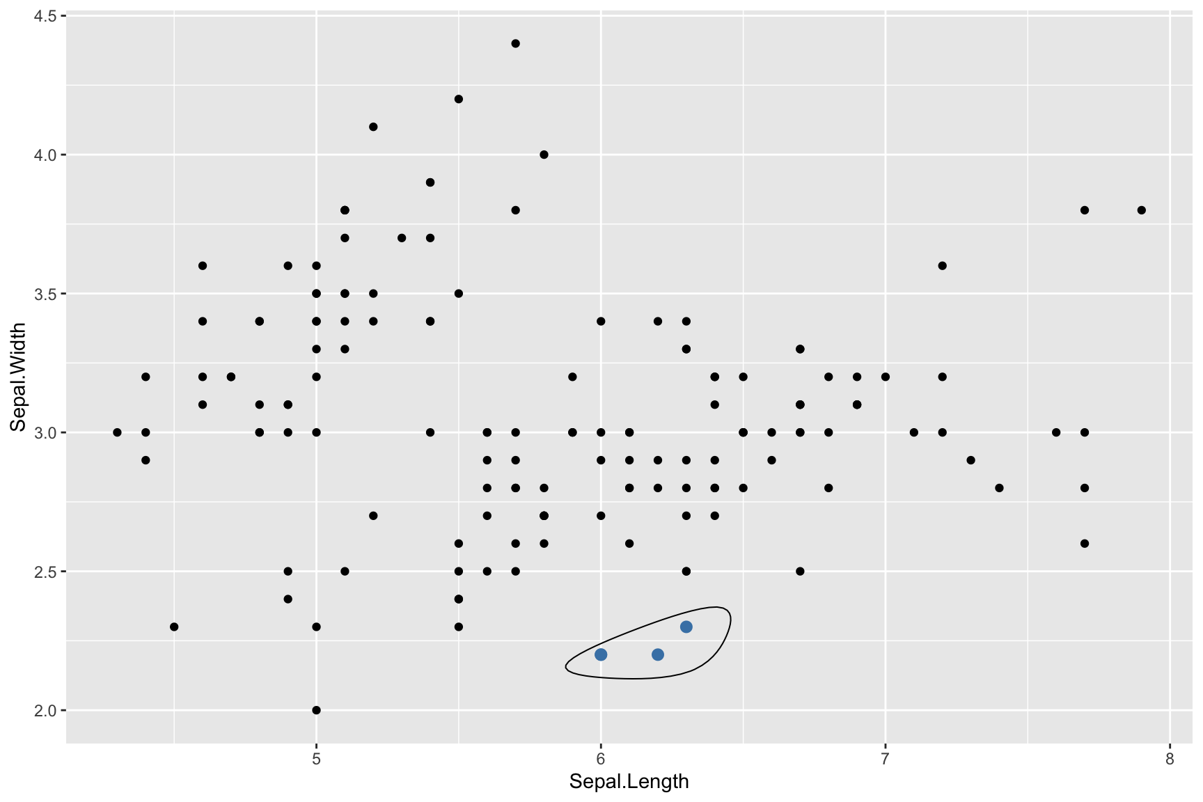 geom_encircle(data = subset(iris, Sepal.Width < 2.5 & Sepal.Length > 5.5), s_shape = 0) + # encircle points