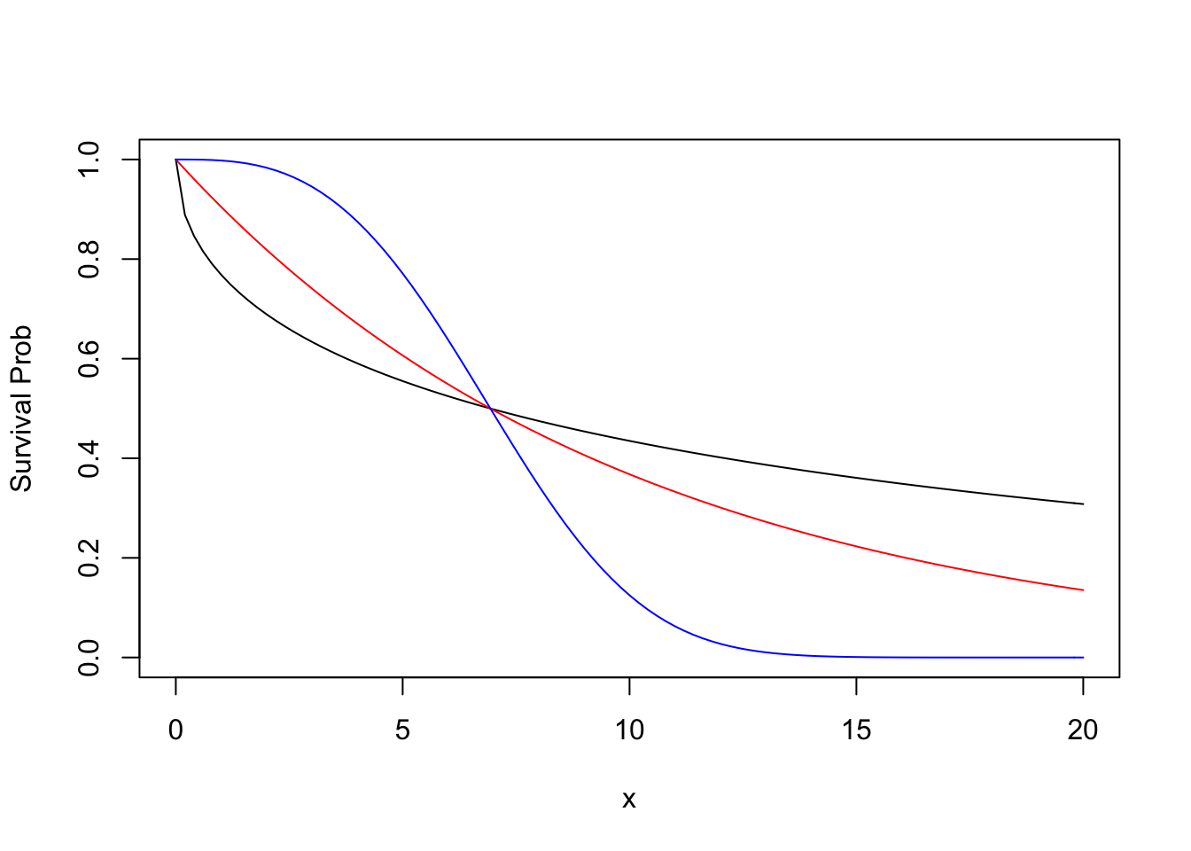 curve(f1, from = 0, to = 20, ylim = c(0, 1), ylab = "Survival Prob")