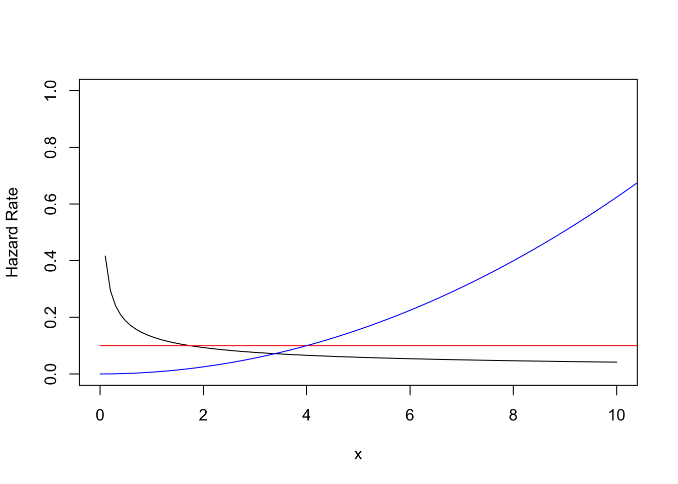curve(0.26328 * 0.5 * x^-0.5, from = 0, to = 10, ylim = c(0, 1), ylab = "Hazard Rate")