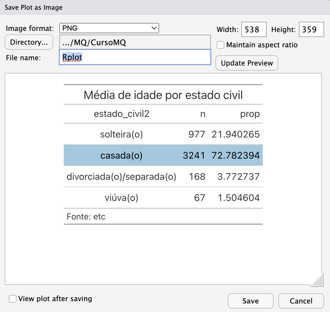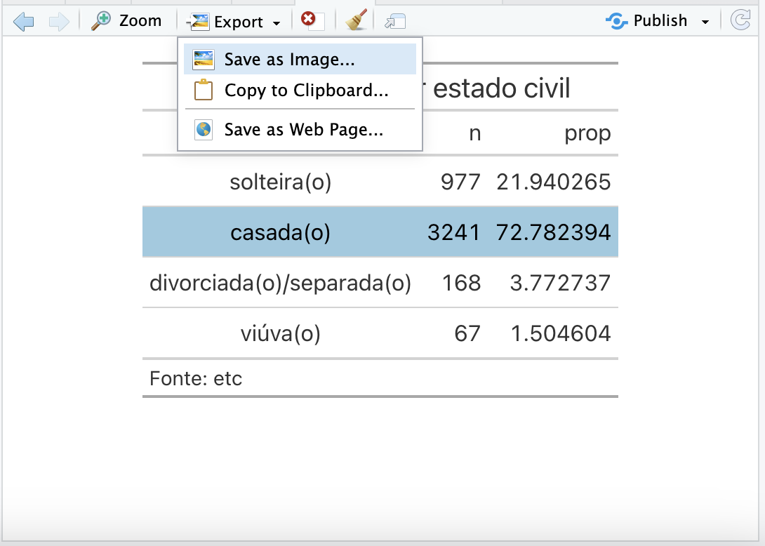 Tabelas que são visualizadas na aba Viewer do R (como as tabelas do pacote gt) podem ser exportadas diretamente como imagem no botão Export.