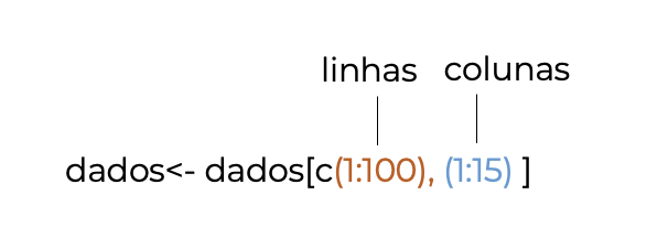 Digamos que queremos selecionar apenas as 100 primeiras linhas. O operador : indica que queremos remover da linha 1 até a linha 100 (1:100). Poderíamos também precisar o número específico das linhas queremos manter, no entanto esse método não é prático quando queremos remover um número grande de elementos.