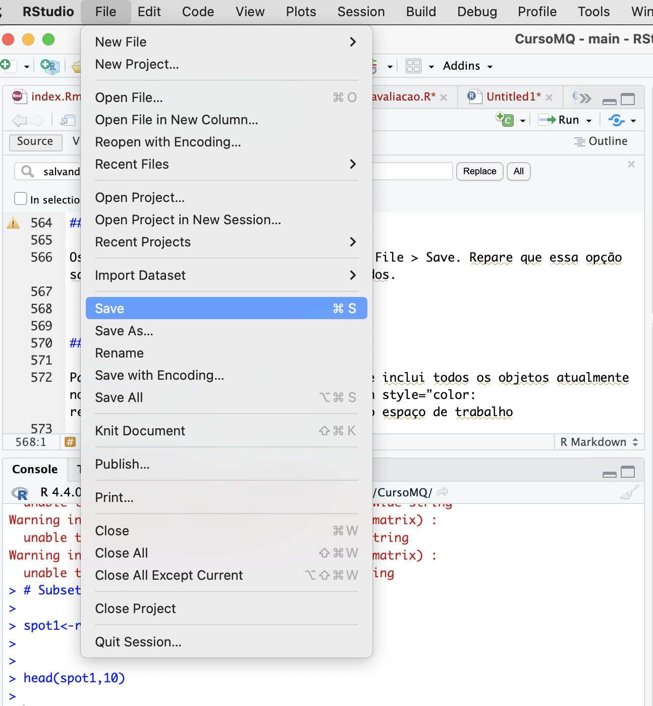Os arquivos R podem ser salvos no caminho File > Save. Podemos também salvar um arquivo utilizando o atalho control + S.