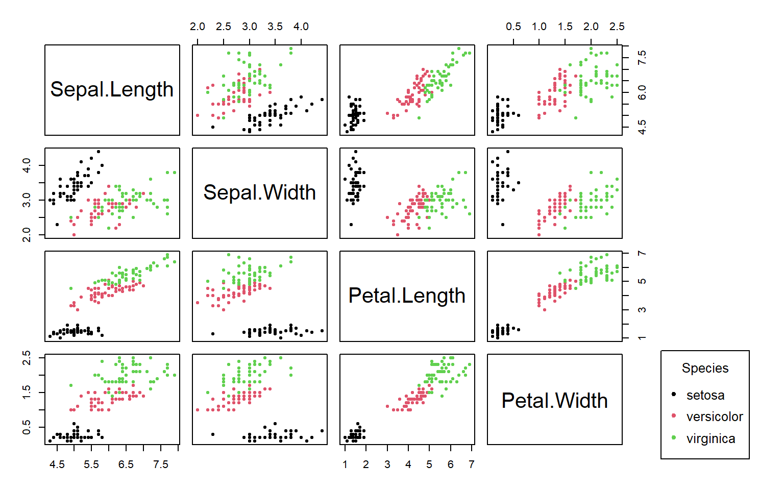 legend("bottomright", title = "Species", legend = levels(groupe), col = c(1,2,3), cex = 0.8, pch = c(20,20,20))