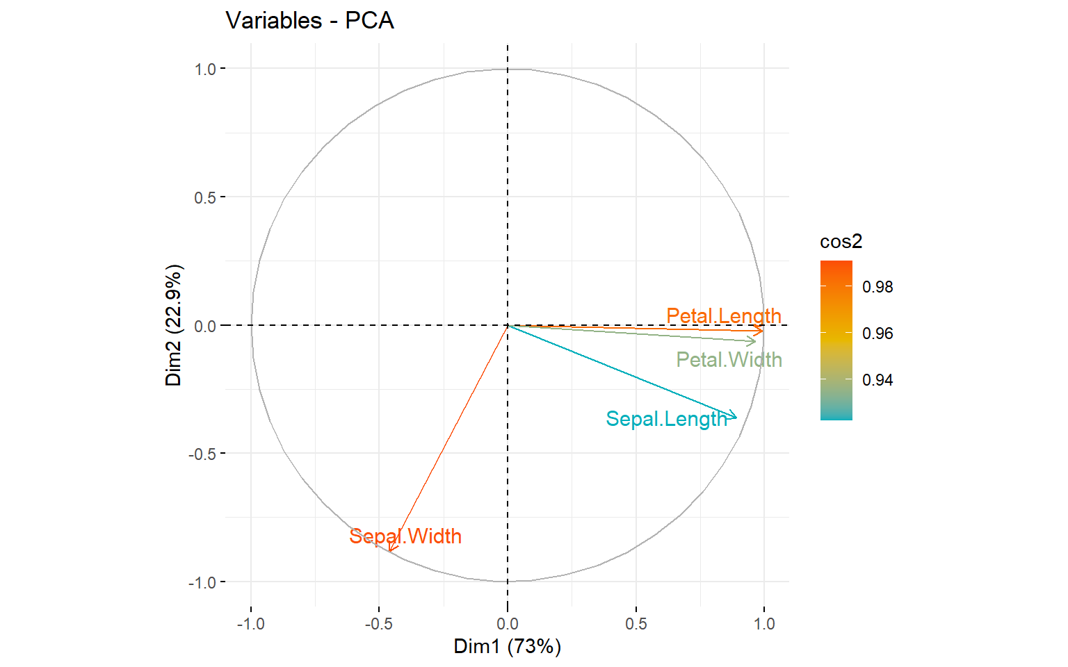 Cercle des corrélations : représentation des corrélations entre les variables de départ et les composantes principales. Les flèches peuvent être colorées en fonction d’une autre variable, ici cos2.
