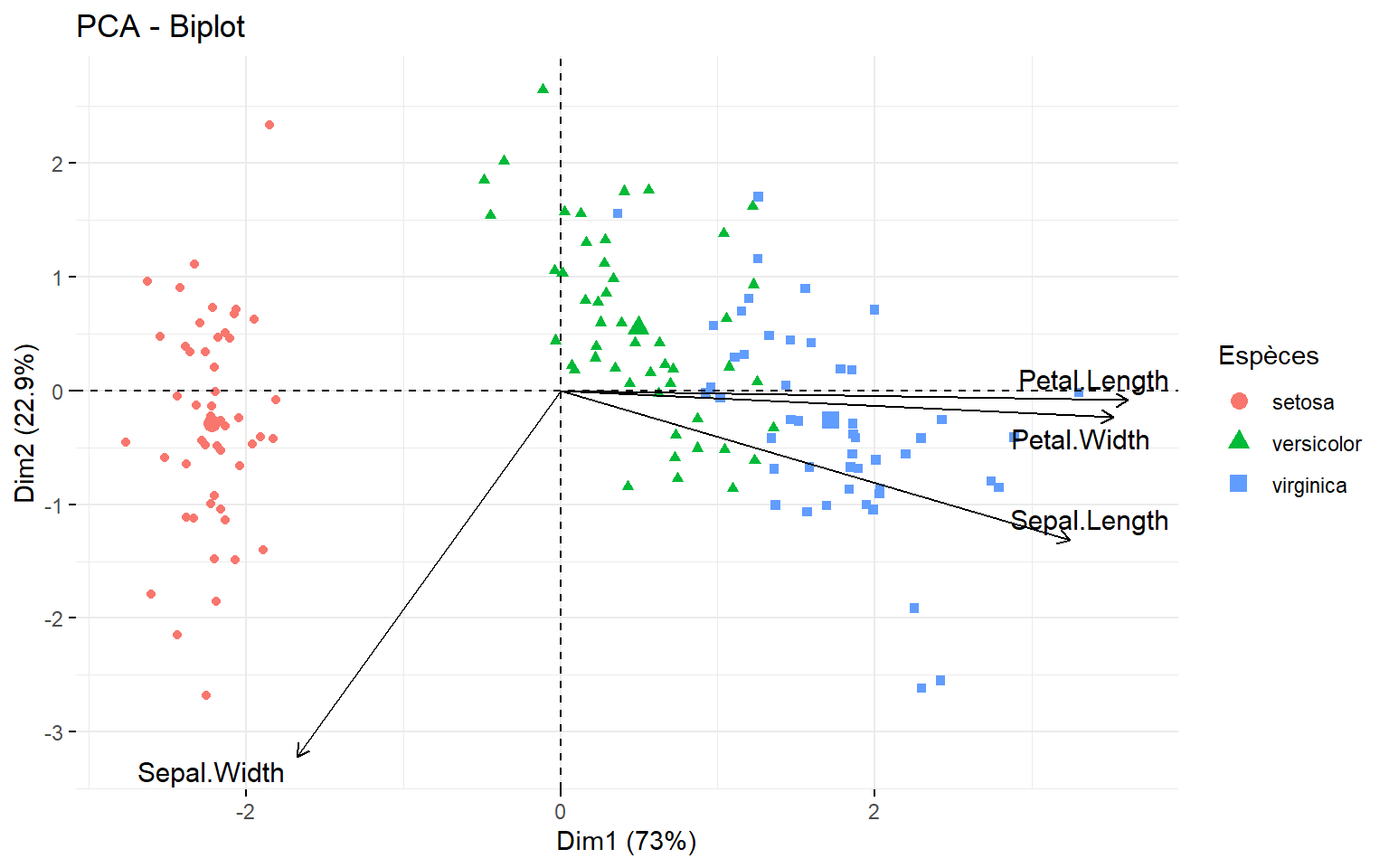 | Biplot variables-individus | factoextra::fviz_pca_biplot(res, ..) |