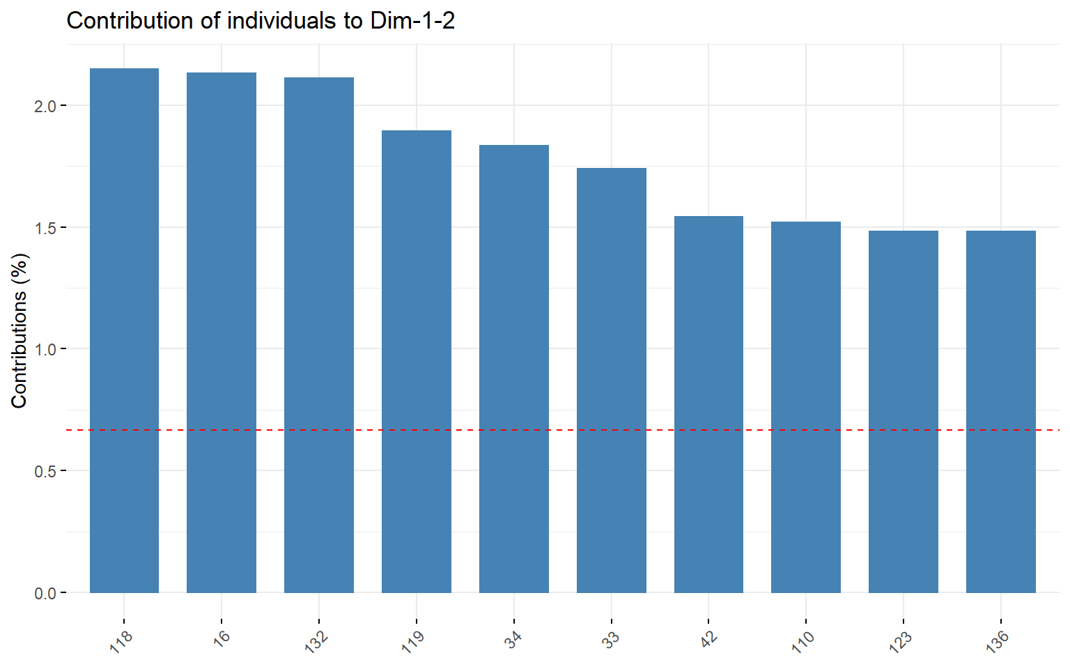 | Visualiser les contributions des individus | factoextra::fviz_contrib(res, choice = "ind", ..) |