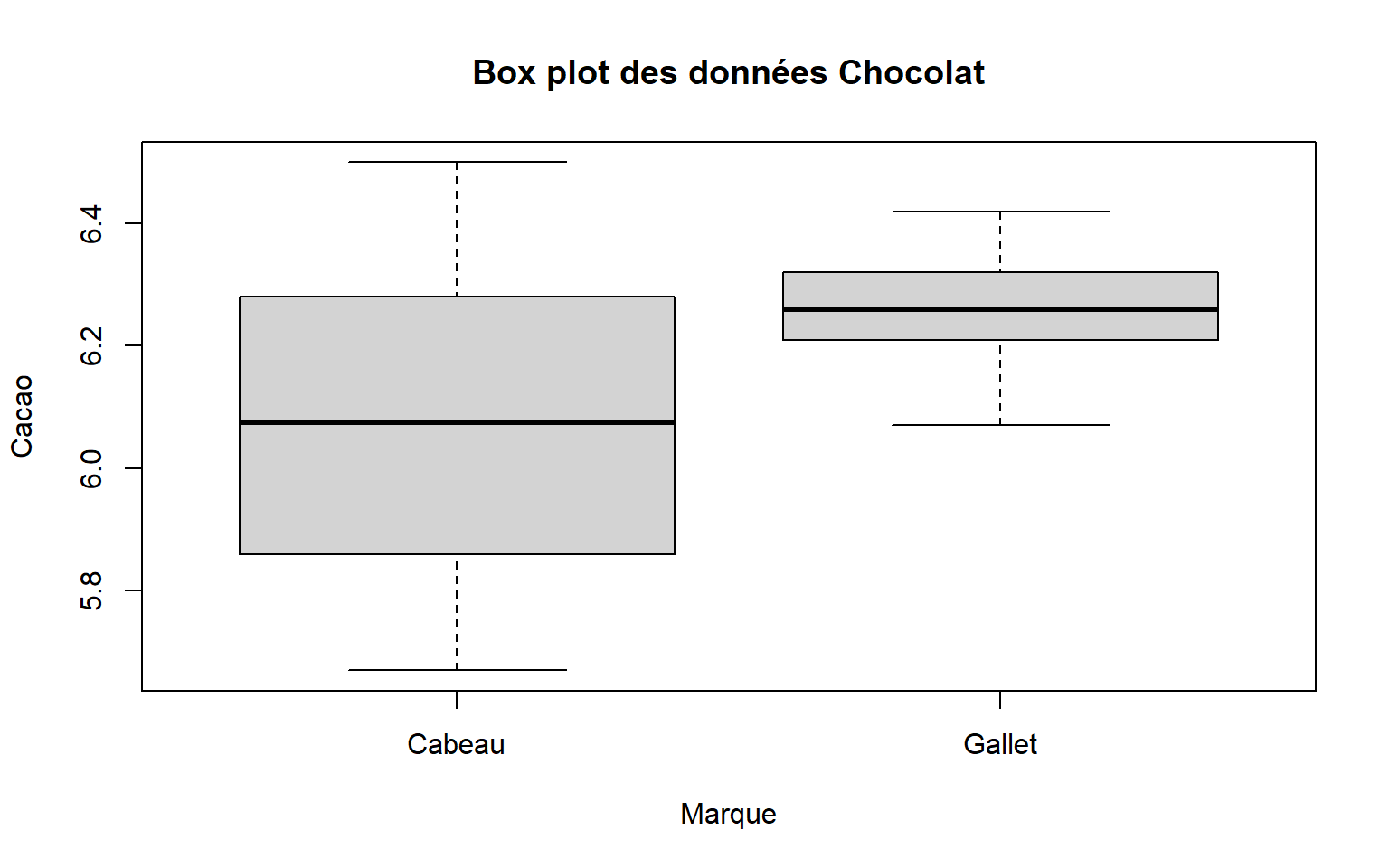 Les fonctions de cette section sont illustrées sur base du jeu de données : chocolat.xlsx (disponible sur moodle). Ce data.frame de taille 20x2 reprend des mesures de la teneur en cacao de 20 plaquettes de chocolat de marque “Cabeau” et “Gallet”.