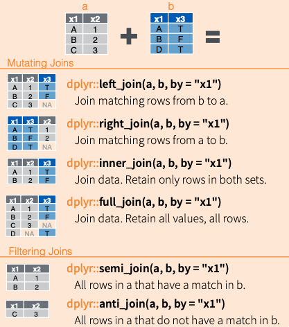 Left joins return all rows which are in x. If a column is in x but not in y, an NA will be included at this position. Right joins work vice versa.