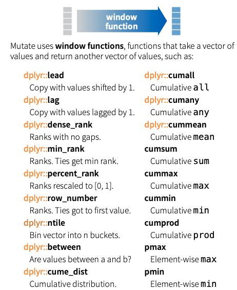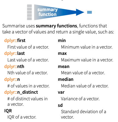 arrange()– sort valuesfilter()– pick observationsmutate()– create new variables (columns)select()– select variablessummarize()– create summaries from multiple values