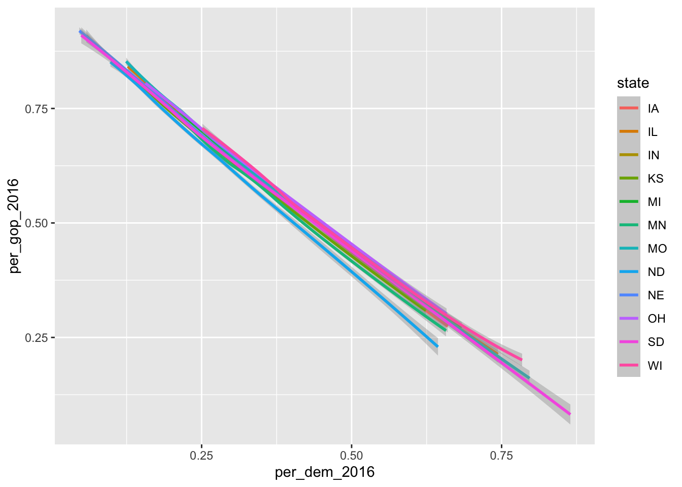 geom_smooth(aes(x = per_dem_2016, y = per_gop_2016, color = state))`geom_smooth()` using method = 'loess' and formula 'y ~ x'