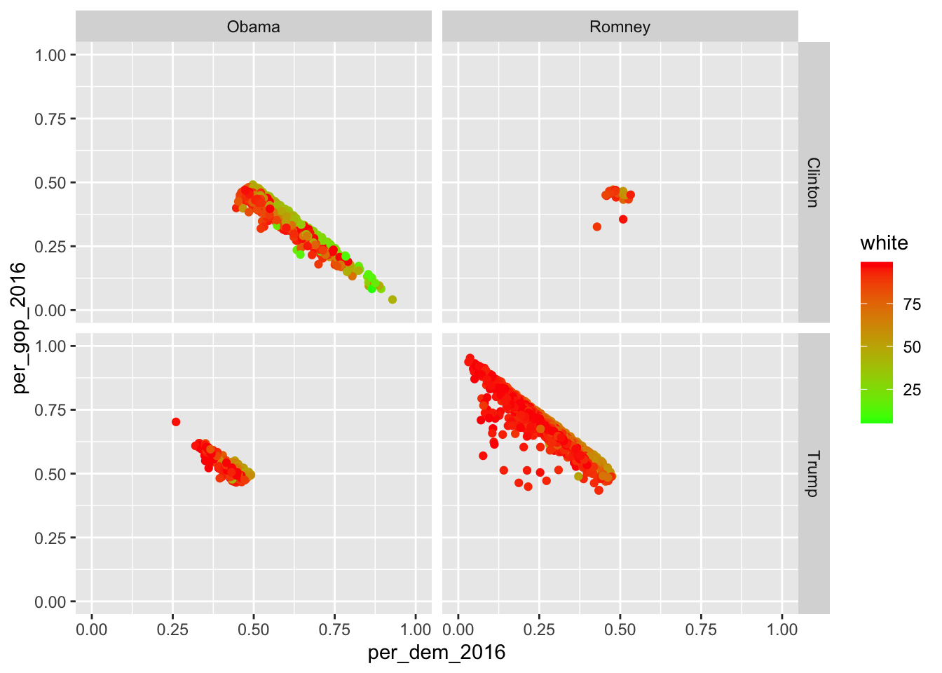 Apart from that, I can also spread it out using two different variables. Here, I will look at differences in the distribution of whites in the counties split up by who won in 2016 and 2012. This can be achieved using facet_grid(categorical_variable_1~categorical_variable_2). The former one will be put into rows, the latter into columns.