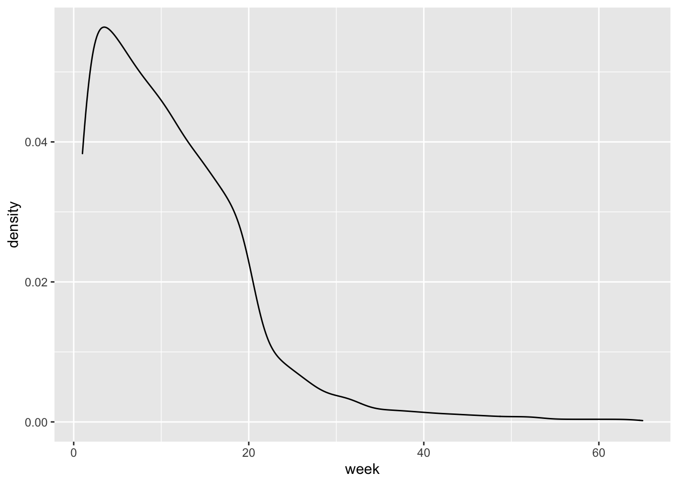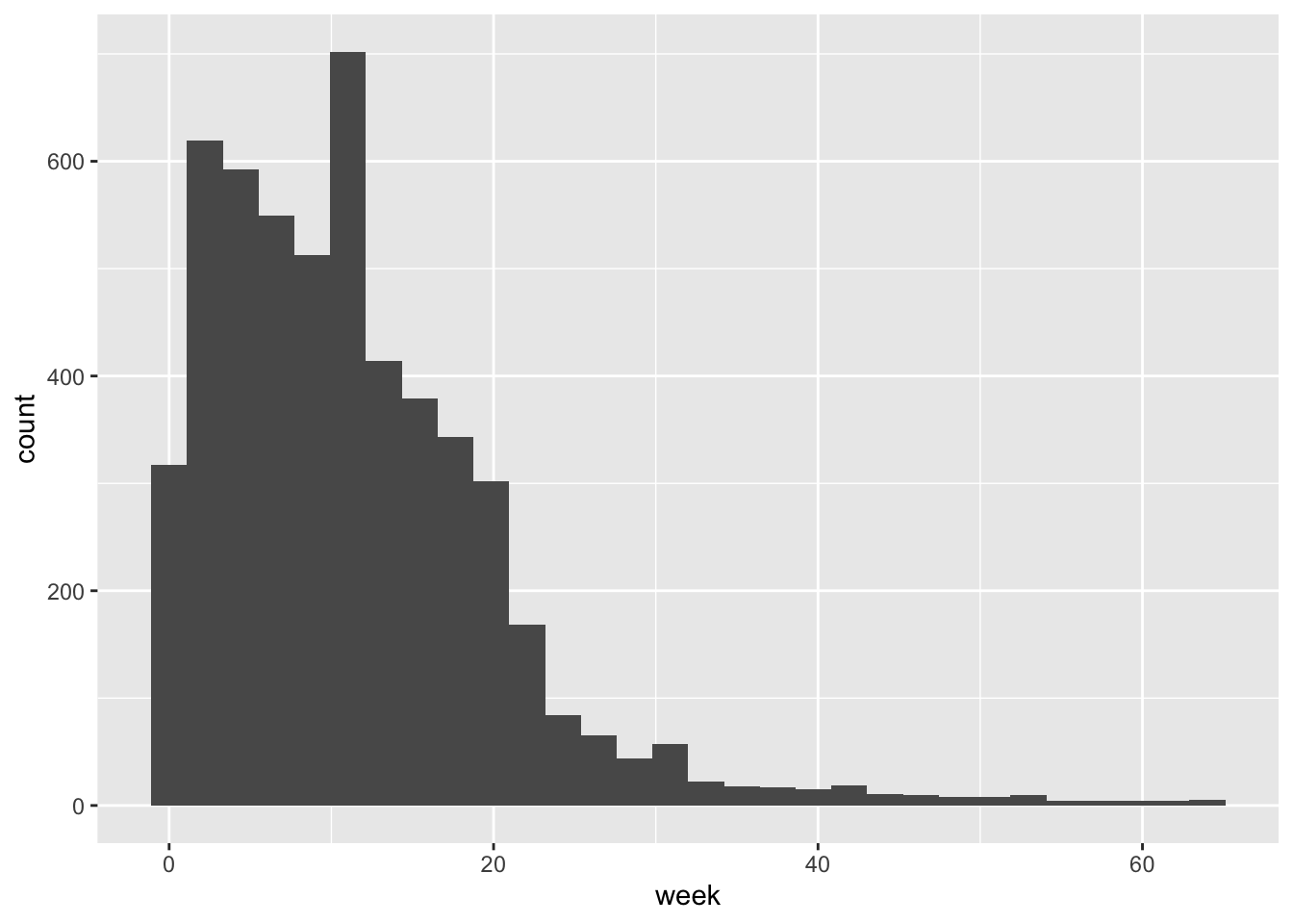 geom_histogram(aes(x = week))`stat_bin()` using `bins = 30`. Pick better value with `binwidth`.