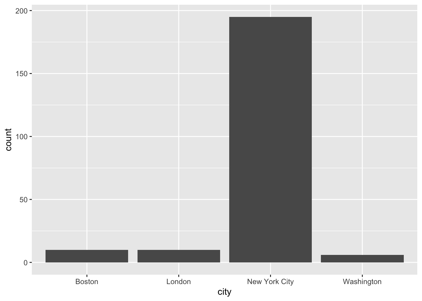 # geom_bar(aes(x = city)) 9.1.1 The layers