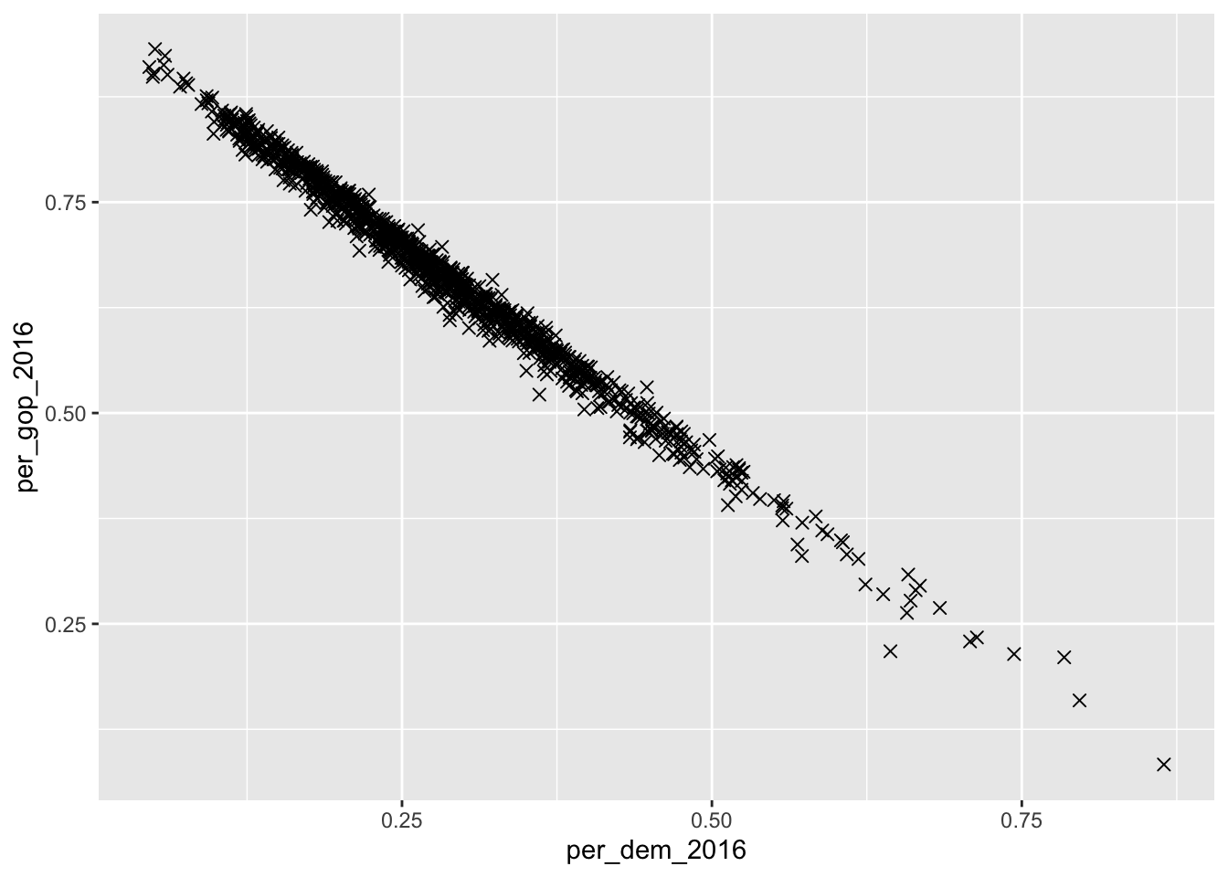 geom_point(aes(x = per_dem_2016, y = per_gop_2016), shape = "cross", size = 2)