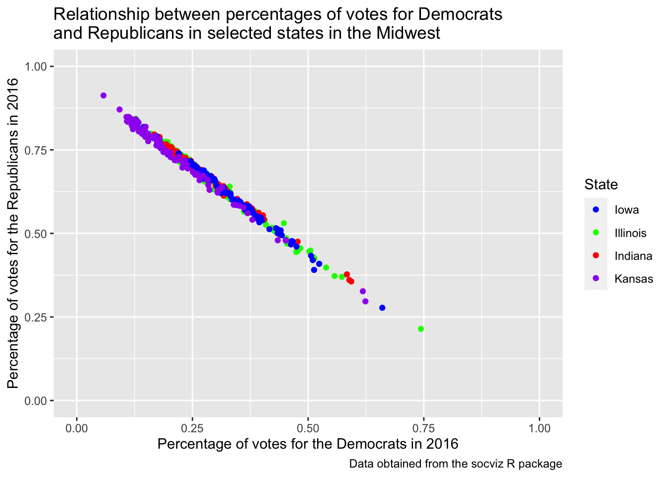 labs(title = "Relationship between percentages of votes for Democrats \nand Republicans in selected states in the Midwest",
