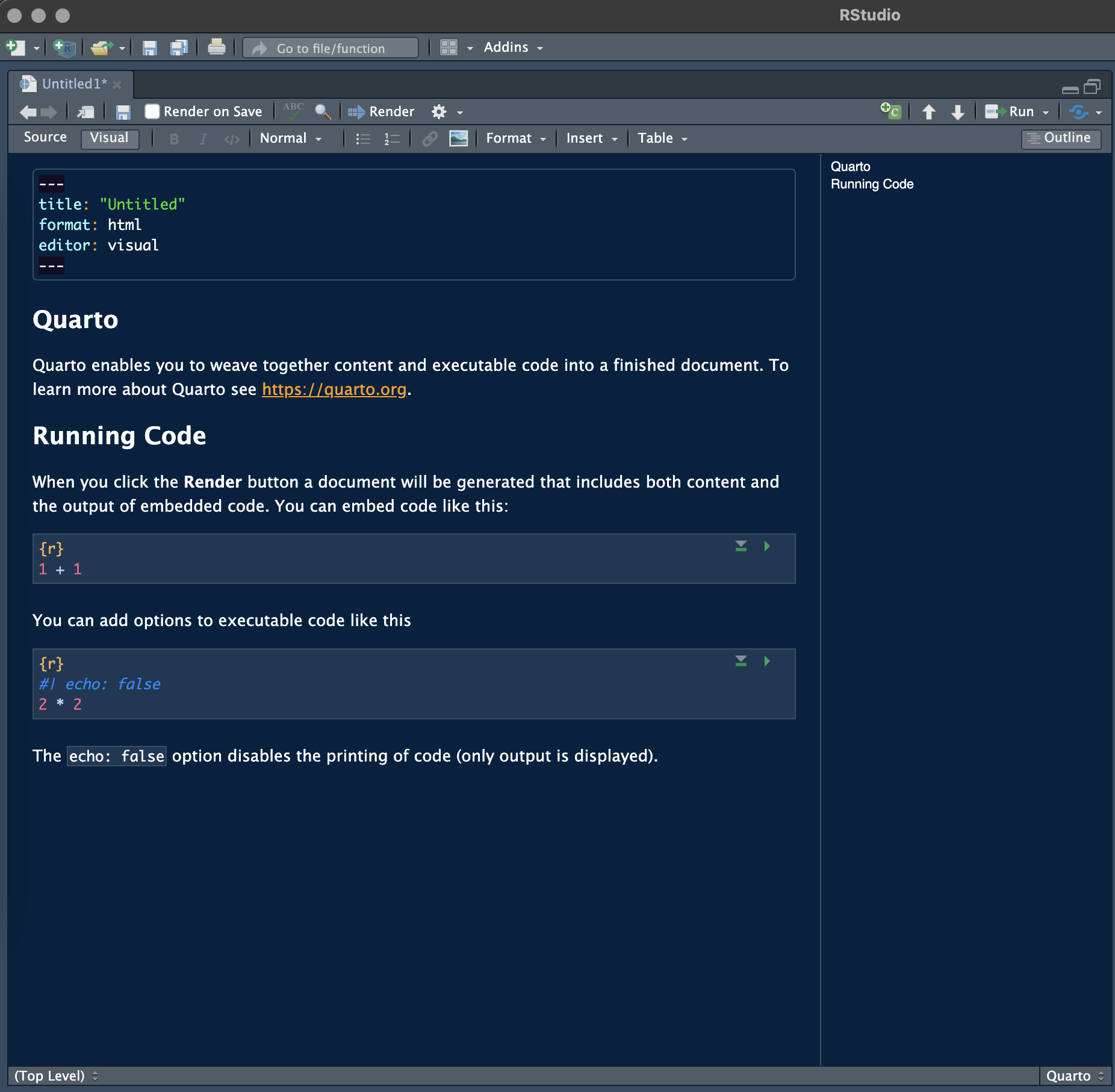 For your first Quarto document, choose HTML and click “OK”. Then, you see a new plain-text file which looks like this: