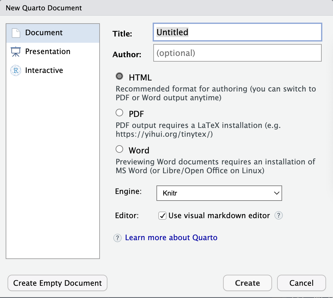 Note that you could also do a presentation (with the beamer package), a shiny app, or use templates. We will focus on simple Quarto documents. Here, you can type in a title, the name(s) of the author(s), and choose the default output format. For now you have to choose one, but later you can switch to one of the others whenever you want to.