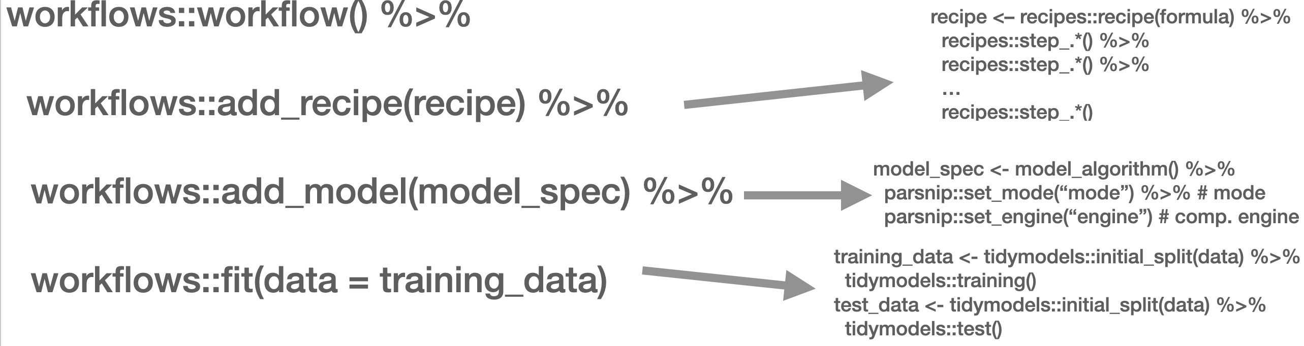 This is mirrored in the workflow() function from the workflows (Vaughan 2022) package. There, you define the pre-processing procedure (add_recipe() – created through the recipe() function from the recipes (Kuhn and Wickham 2022) and/or textrecipes (Hvitfeldt 2022) package(s)), the model specification with add_spec() – taking a model specification as created by the parsnip (Kuhn, Vaughan, and Hvitfeldt 2022) package.