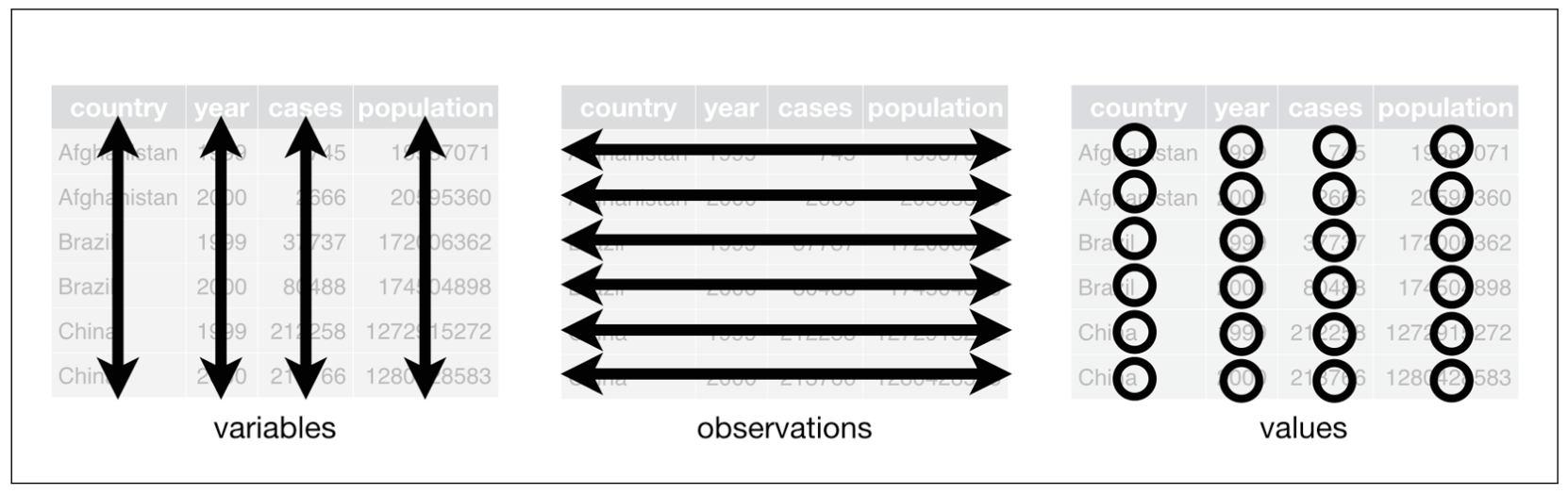 data sets can be structured in many ways. To make them tidy, they must be organized in the following way (this is taken from the R for Data Science book (Wickham and Grolemund 2016a)):