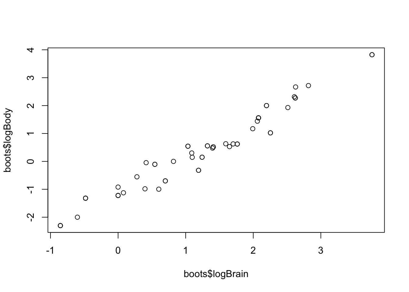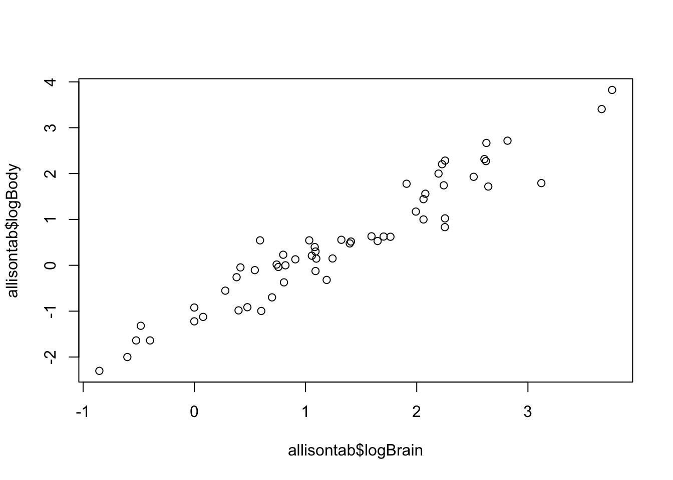 ## lm(formula = logBrain ~ logBody, data = allisontab)