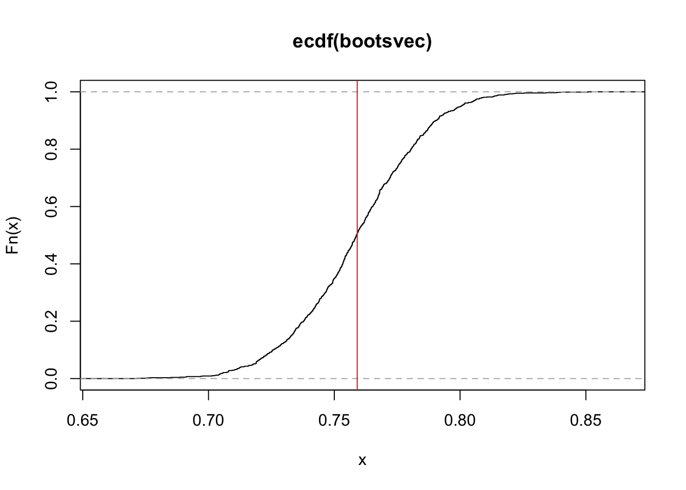 We are now ready to obtain confidence intervals (CIs) of our original parameter estimate, using our bootstrapped distribution. There are multiple ways to obtain CIs from a bootstrapped distribution. Some of these assume that the ECDF has particular properties, while others are more generally applicable: