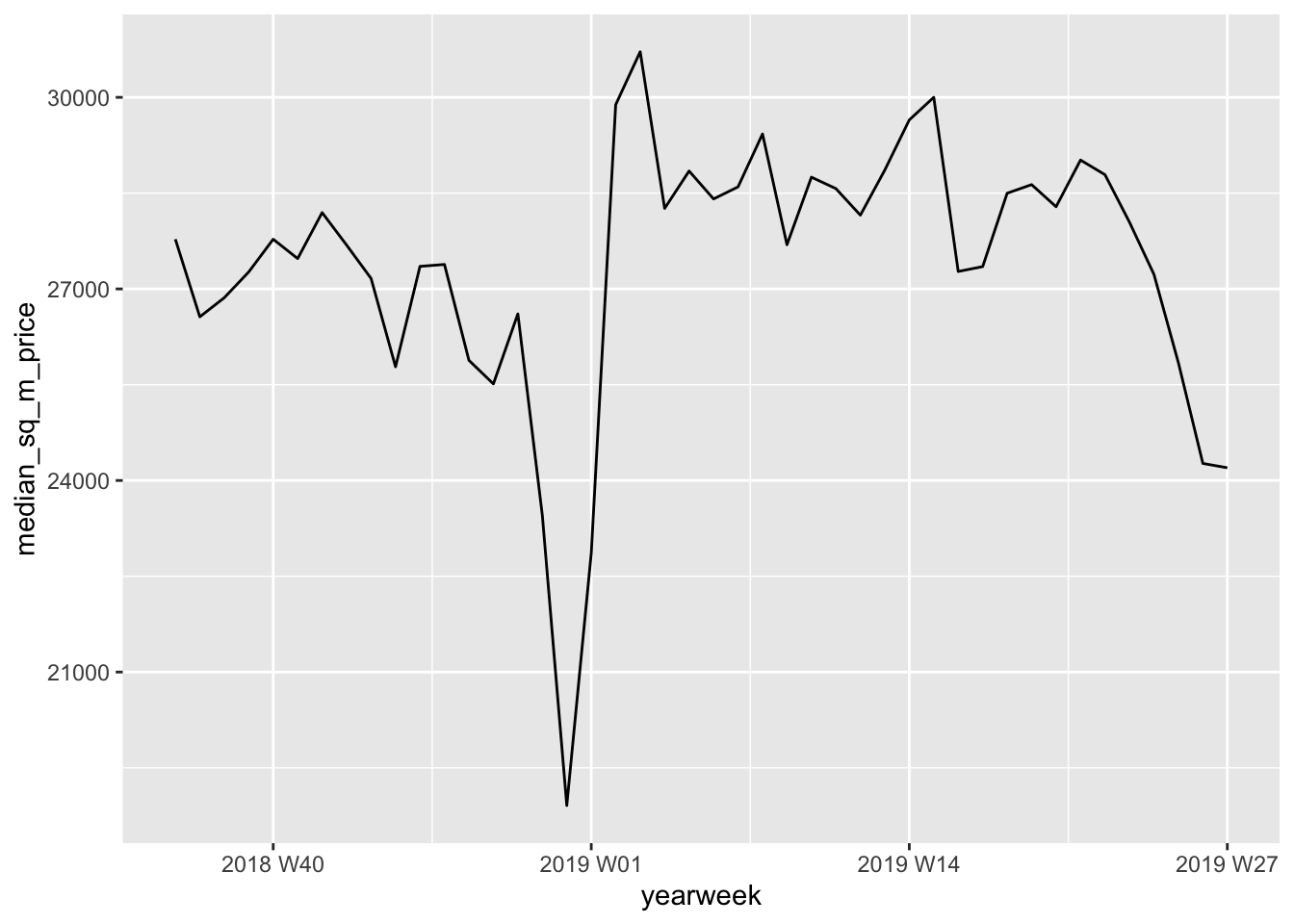 ggplot(aes(yearweek, median_sq_m_price)) +