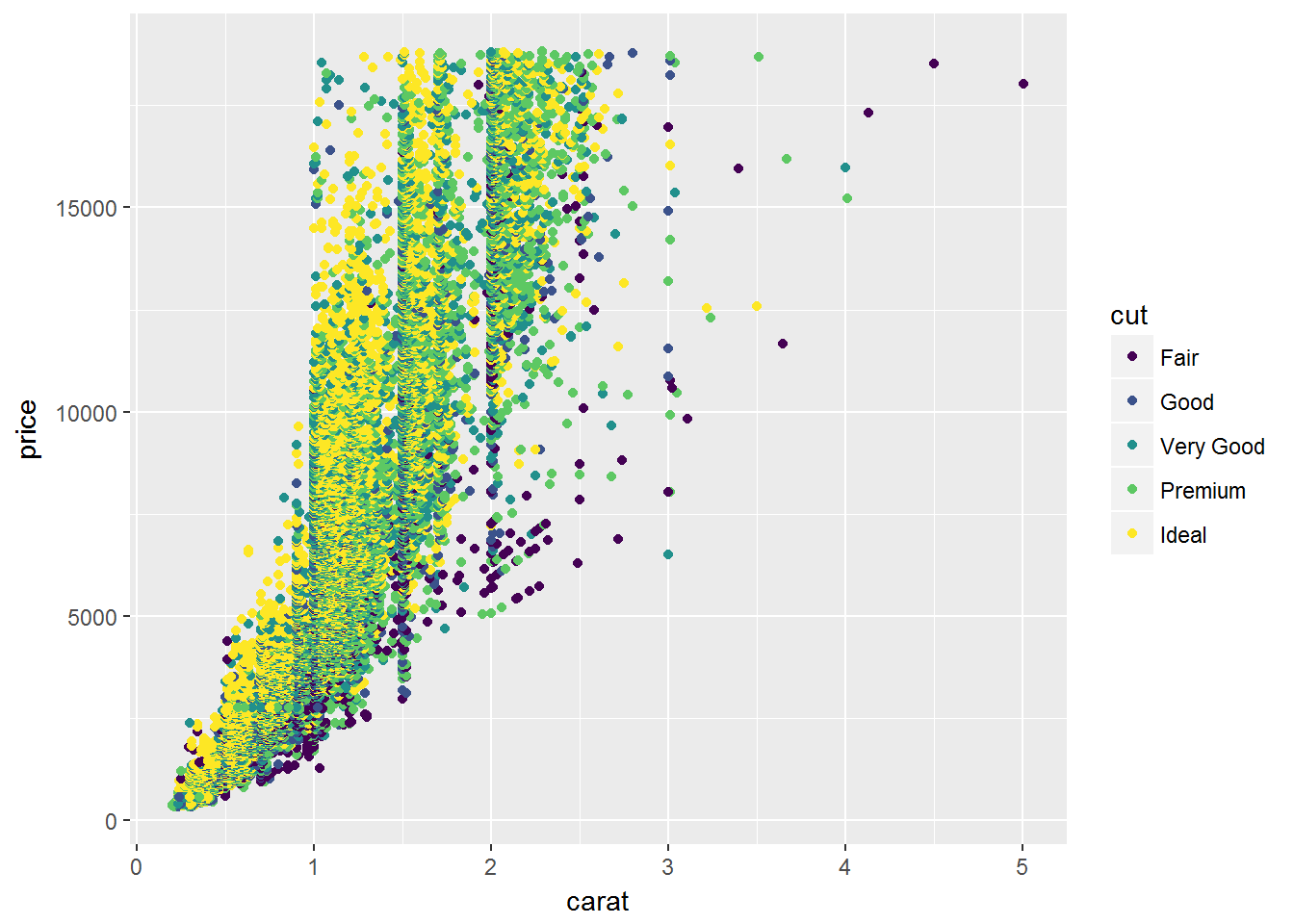 library(ggplot2)Vi kan testa paketet genom data setet diamonds som är inbyggt i ggplot2. Det innehåller data över c:a 54 000 diamanter med information om bl.a. pris, slipkvalitet och karat. Vi plottar karat mot pris och färglägger med slipkvalitet.