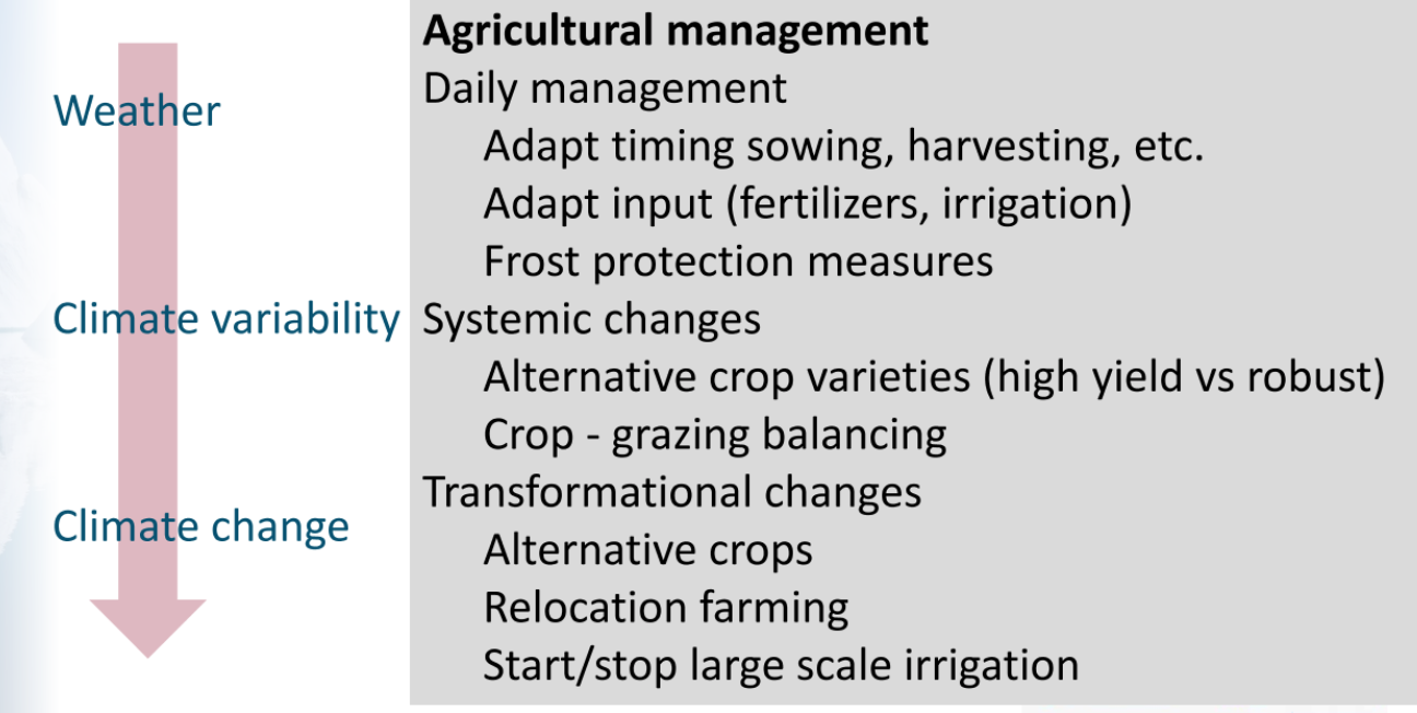 The types of data needed, depends on the topic/sector covered and type of decisions that need to be made. For example in the water sector, agricultural sector and insurance sector both weather (daily decisions), climate variability (systemic changes) and climate change (transformational changes) information could be needed: