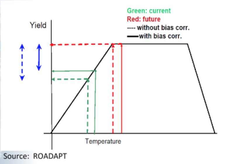 Below is a schematic example of the possible effect of climate model bias on the estimation of the impact of climate change. The climate model output has a systematiclly too low temperature. Since the impact model has a treshold and a non-linear relation with temperature, one makes an overestimation of the impact of climate change on yield without bias-correction.
