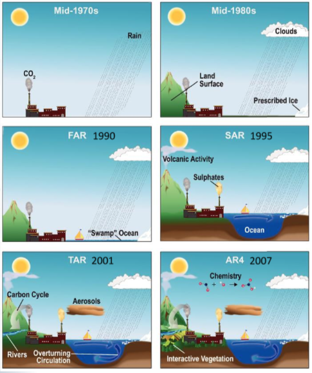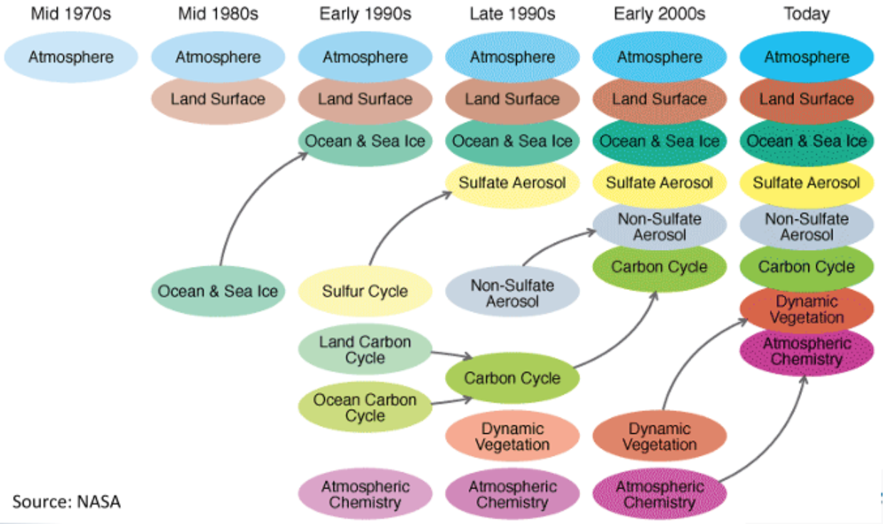 For decades scientists have been using mathematical models to help us learn more about the Earth’s climate. Over time these models have increased in complexity, as separate components ahve been merged to form coupled systems. The figures below shows the evolution of such systems (first figure from NASA, second figure from IPCC, 2007)