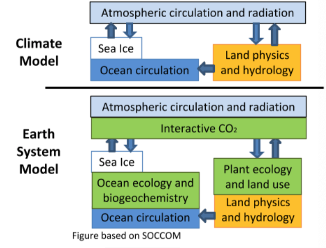 Earth System Models (ESMs) represent advanced and complex descriptions of the Earth’s atmosphere, ocean, land and surface. The figure shows the difference between a climate model and an ESM. The componenets in green boxes (biochemical) makes a climate model an ESM.