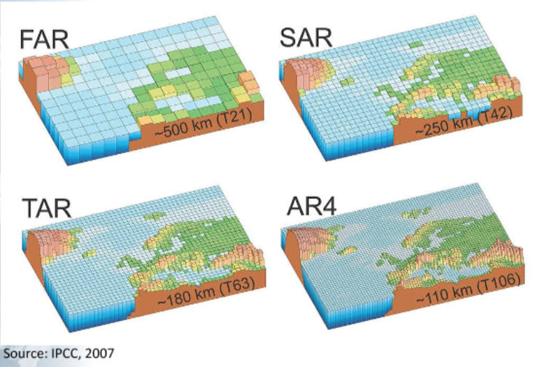 The figure below shows the increasing spatial resolution of climate models used through the first four IPCC assessment reports: first (“FAR”) published in 1990, second (“SAR”) in 1995, third (“TAR”) in 2001 and fourth (“AR4”) in 2007. In the fifth report from 2014 the resolution of several global models was about 50 km (IPCC, 2013). The increased spatial result was a result of increased computing power and a request for better representation of all kind of climate effects, including extreme events.