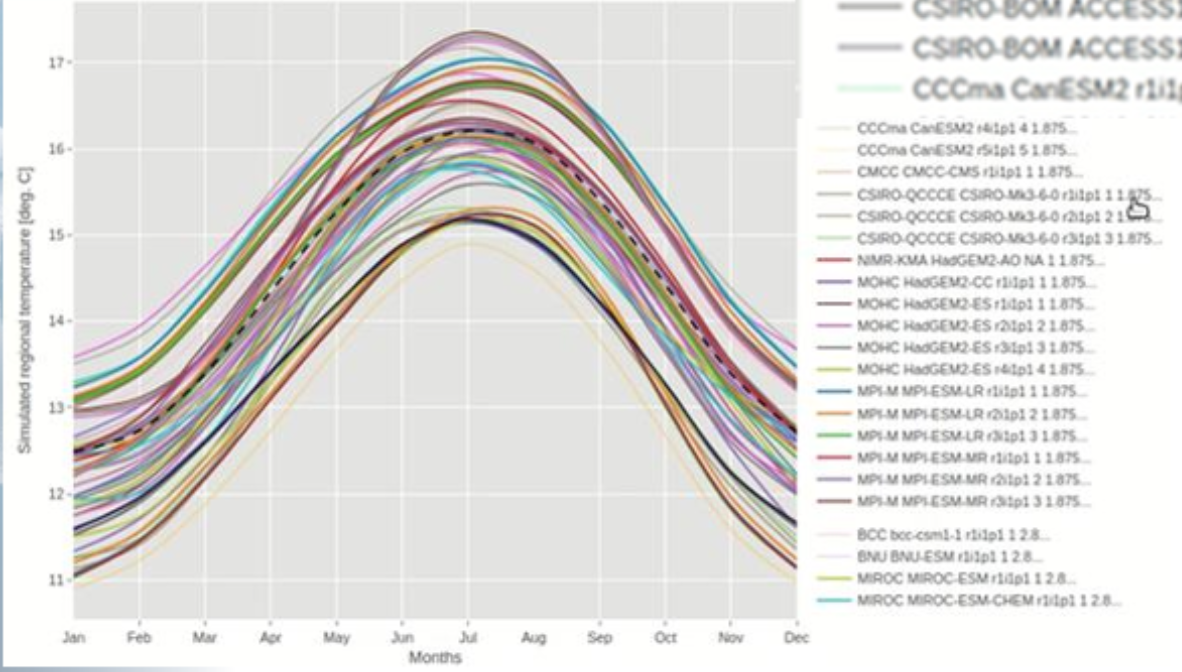 Below figure is an example with many different climate models for the average temperature for the period 1981 - 2010 - for South Europe/Mediterranean. The dashed line is based on reanalyses.