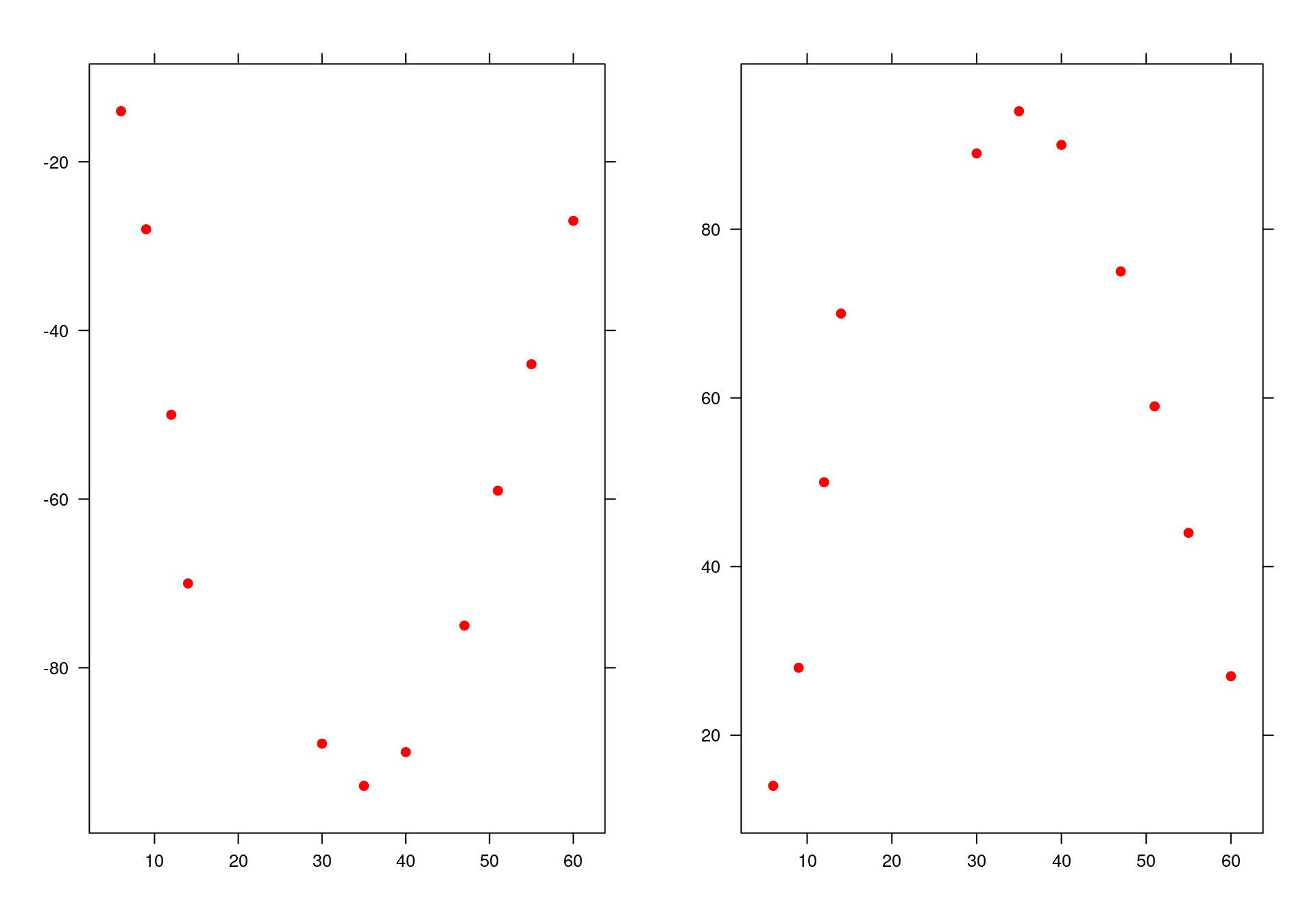 There are two types of curves when we have only one x variable that have an influence on y (see graphs above). The curve on the left-hand side is called a concave upward curvature, whilst the curve on the right is called a concave downward curvature. When we have a concave upward curvature (curve on the left), the value of \(\beta_{2}\) in the second-order model given above is positive (> 0) and when we have a concave downward curvature (curve on the right), the value of \(\beta_{2}\) is negative (< 0). Remember this for short questions.