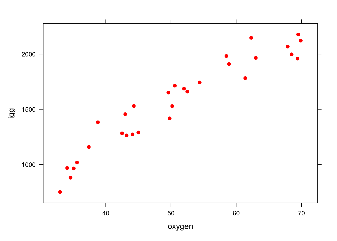 xyplot(igg ~ oxygen, pch=19, col="red")