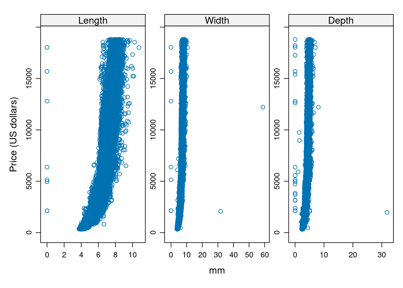 Example 9.3 A dataset containing the prices and other attributes of almost 54,000 diamonds. The variables length (x), width (y) and depth (z) will be used for this example.
