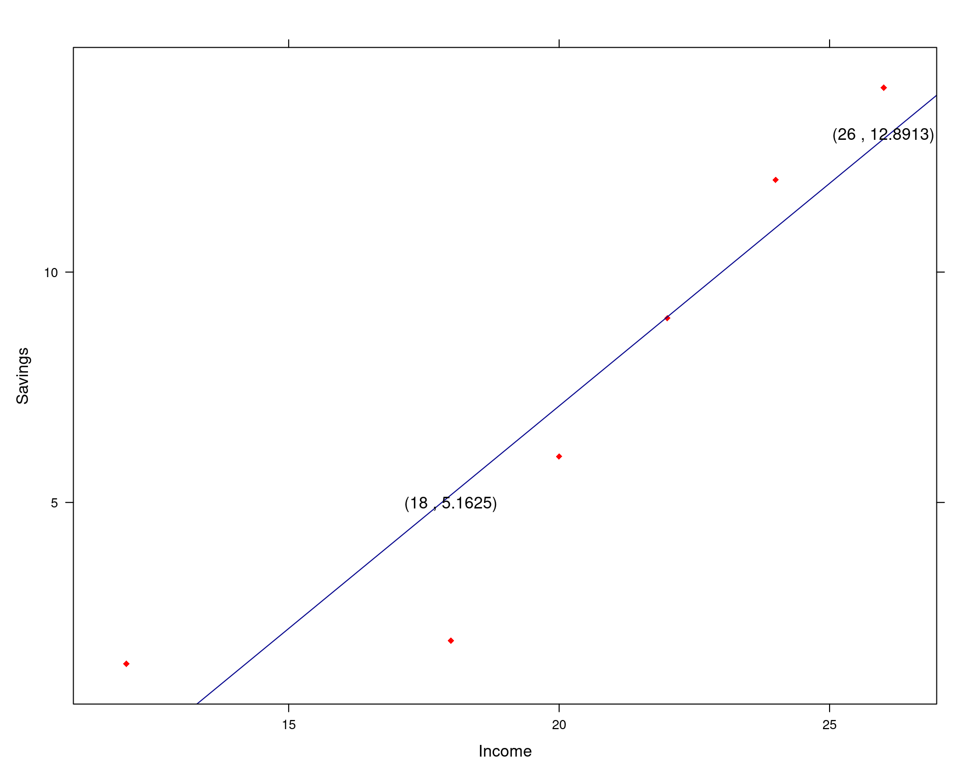Now we plot the two points (x , y) = (18 , 5.1625) and (26 , 12.8913) on the scatterplot and then draw a straight line through the two points. The regression line through the dots are given in the figure below.