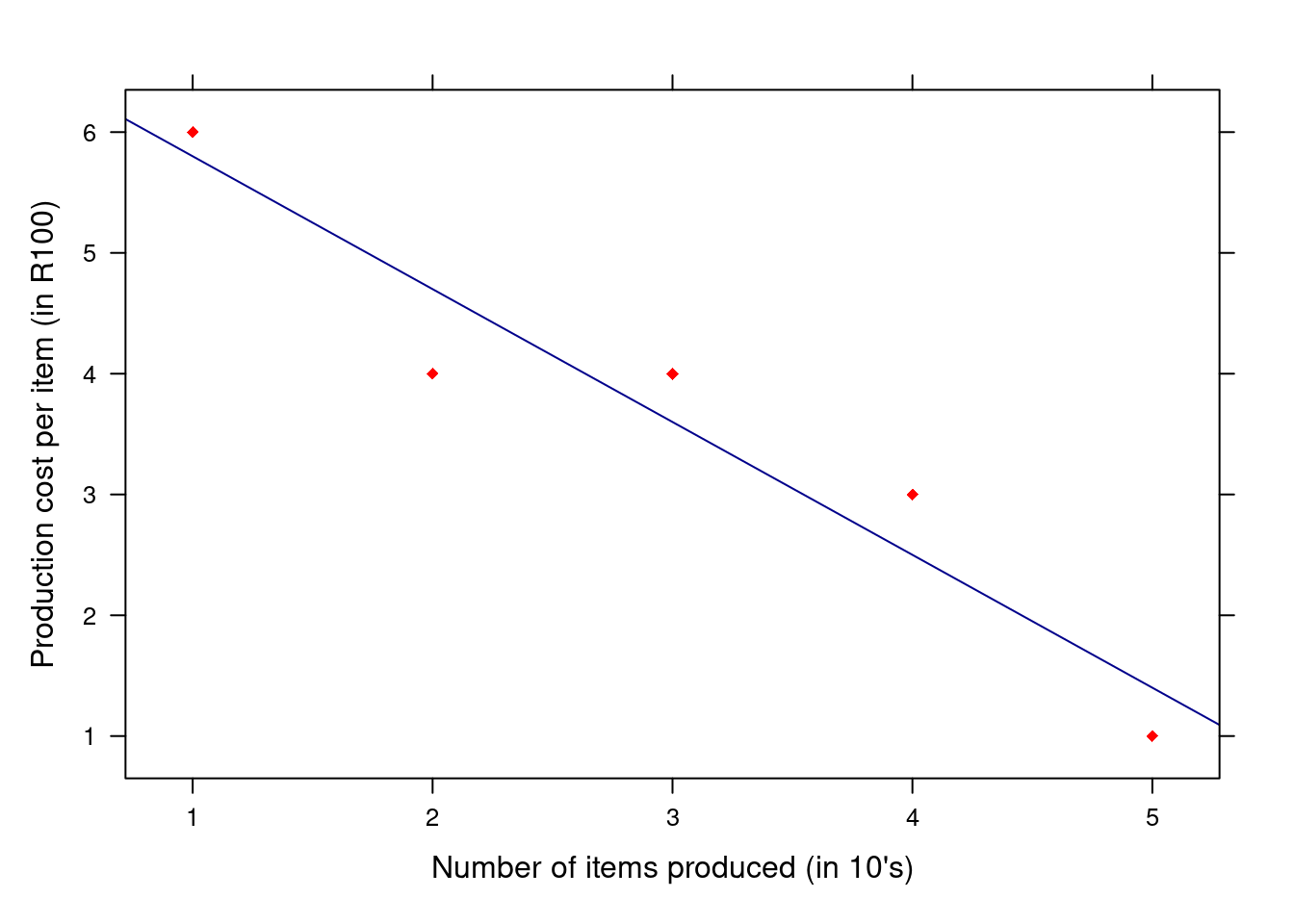 A company wants to investigate the relationship between the number of items produced, x (given in terms of 10 items), and the production cost per item, y (given in terms of R100). The data are given below.
